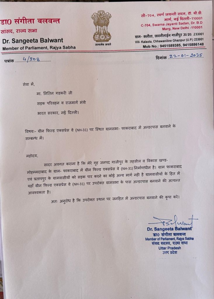 गाजीपुर।मोहम्मदाबाद के ग्रामसभा फ़ाक़राबाद व प्रतापपुर होते हुए गाजीपुर- बलिया ग्रीन फिल्ड एक्सप्रेस वे (NH-31) का निर्माण कार्य चल रहा है। ग्रामवसियों ने राज्यसभा सांसद डा. संगीता बलवंत से अंडरपास बनवाने के लिए माँग किए ।ग्रामवासियों का कहना है की ग्रामसभा फ़ाक़राबाद व प्रतापपुर, निर्माणाधीन ग्रीनफील्ड एक्सप्रेस वे के उस पार है, अंडरपास न होने से गांव में आवागमन का रास्ता ही बंद हो जाएगा। दोनों गांव के आवागमन हेतु अन्य कोई दूसरा रास्ता भी नहीं है। राज्यसभा सांसद ने ग्रामवासियों की समस्याओं को सुनकर सड़क परिवहन एवं राजमार्ग मंत्री नितिन गडकरी को पत्र लिखकर अंडरपास बनवाने की मांग की।