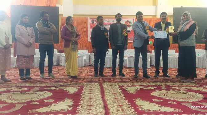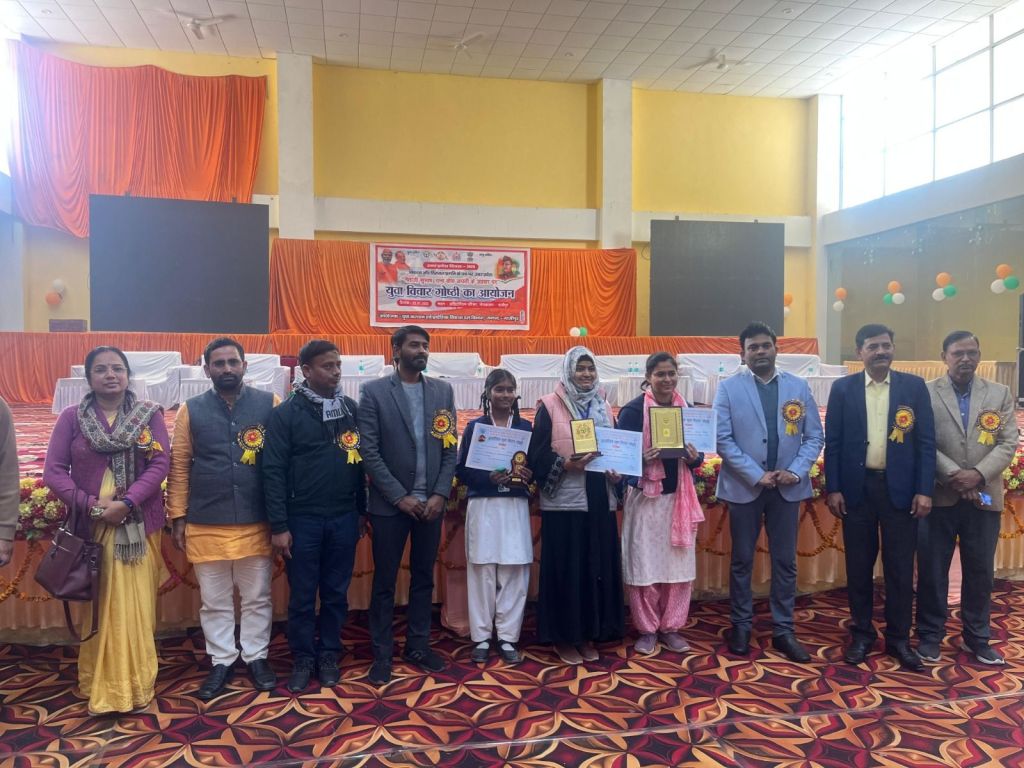 गाजीपुर। जिलाधिकारी आर्यका अखौरी एवं मुख्य विकास अधिकारी संतोष कुमार वैश्य के मार्ग निर्देशन में युवा कल्याण एवं प्रादेशिक विकास दल विभाग के तत्वाधान में उत्तर प्रदेश दिवस 2025 के अवसर पर नेता जी सुभाष चन्द्र बोस जयंती की 128 वीं वर्षगांठ पर ऑडिटोरियम परिसर गाजीपुर में युवा विचार गोष्ठी का आयोजन किया गया। कार्यक्रम का शुभारंभ जिला विकास अधिकारी एवं जिला समाज कल्याण अधिकारी द्वारा सुभाष चन्द्र बोस के चित्र पर पुष्प एवं माल्यार्पण कर किया गया। युवा विचार गोष्ठी में प्रतिभागियों ने बढ़-चढ कर हिस्सा लिया। कार्यक्रम का विषय ‘‘राष्ट्र के निमार्ण में युवाओं की भूमिका‘‘ था जिस पर प्रतिभागियों ने अपने विचार व्यक्त किए, जिसमें युवा कल्याण विभाग, खेल विभाग, माध्यमिक शिक्षा विभाग के कुल 250 प्रतिभागियों ने भाग लिया। कार्यक्रम में युवाओं को राष्ट्रीय सड़क सुरक्षा कार्यकम, के संबंध में जागरुक किया गया। जिला विकास अधिकारी सुभाष चन्द्र सरोज द्वारा प्रतिभागियों को संबोधित कर पराक्रम दिवस पर नेता जी की जीवन संघर्ष, उनकी उपलब्धियां एवं विचार व्यक्त करते हुए उत्साहवर्धन किया। प्रथम पुरस्कार दीपशिखा रेवतीपुर, द्वितीय पुरस्कार जिकरा खातून करंडा,तृतीय पुरस्कार अंशु सदर ने प्राप्त किया। कार्यक्रम में नेहरु युवा केन्द्र के सुभाष चन्द्र प्रसाद, खेल विभाग के सुदामा, मदन राय, सरिता मिश्रा, क्षेत्रीय युवा कल्याण अधिकारी चन्द्रकान्त यादव, अखिलेश यादव, मो. वकार खान, किशनचन्द, रविशंकर प्रसाद, सिन्धुजा यादव, आंचल सिंह आदि लोग उपस्थित रहे। कार्यकम का संचालन अनूप राय द्वारा किया गया। अंत में दिलीप कुमार जिला युवा कल्याण एवं प्रादेशिक विकास दल अधिकारी द्वारा सभी का आभार व्यक्त किया गया। विगत है कि विभाग द्वारा राष्ट्रीय सड़क सुरक्षा जागरुकता कार्यकम दिनांक 01-01-2025 से मंगल दलो द्वारा चलाया जा रहा है। जो माह जनवरी के अंत तक चलेगा।
