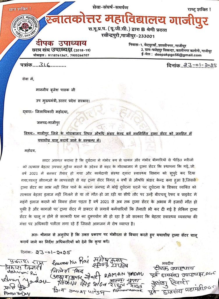 गाजीपुर। गोराबाजार क्षेत्र स्थित नवनिर्मित ट्रामा सेंटर को चालू करायें जाने के सम्बन्ध में पूर्व छात्रसंघ उपाध्यक्ष दीपक उपाध्याय के नेतृत्व में छात्रसंघ प्रतिनिधिमंडल ने उप मुख्यमंत्री बृजेश पाठक के नाम संबोधित पत्रक जिलाधिकारी आर्यका अखौरी को गुरुवार को सौंपा। पूर्व छात्रसंघ उपाध्यक्ष दीपक उपाध्याय ने बताया कि दुर्घटना में गंभीर रूप से घायल और गंभीर बीमारियों से पीड़ित मरीजों को तत्काल बेहतर उपचार मुहैया कराने के उद्देश्य से शहर के गोराबाजार में ट्रामा सेंटर कि स्थापना कि गई, जो वर्ष 2021 में बनकर तैयार हो गया और कार्यदायी संस्था द्वारा स्वास्थ्य विभाग को सुपुर्द कर दिया गया। परन्तु सीएमओ के लापरवाही से यह ट्रामा सेंटर विगत् 4 वर्षों से औषधि भंडार केन्द्र बना हुआ है, जिससे ट्रामा सेंटर का लाभ नहीं मिल पाने के कारण जनपद में कोई दुर्घटना घटने पर दुर्घटना के शिकार व्यक्ति को तत्काल बेहतर इलाज नहीं मिलने से या तो मौत हो जा रही या सीधे तौर पर उन्हें बीएचयू रेफर व प्राइवेट में महंगे इलाज कराने को विवश होना पड़ता है, जो सरकार के बेहतर स्वास्थ्य व्यवस्था कि पोल खोल रहा है।