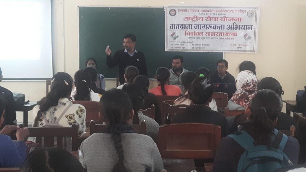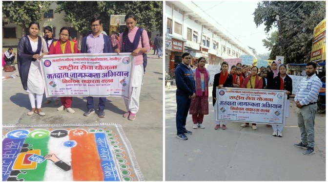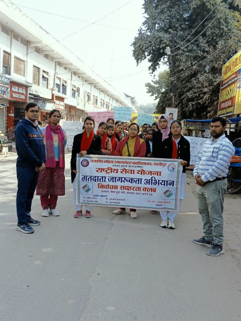 गाजीपुर। शनिवार को राजकीय महिला स्नातकोत्तर महाविद्यालय में राष्ट्रीय सेवा योजना का प्रथम एक दिवसीय शिविर आयोजित किया गया । इस अवसर पर सर्वप्रथम राष्ट्रीय सेवा योजना की स्वयंसेवी छात्राओं द्वारा 15वें राष्ट्रीय मतदाता दिवस के उपलक्ष्य में महाविद्यालय से राइफल क्लब तक एक जागरूकता रैली निकाली गई । रैली को महाविद्यालय की प्राचार्य एवं संरक्षिका प्रो.अनिता कुमारी ने हरी झंडी दिखाकर रवाना किया ।