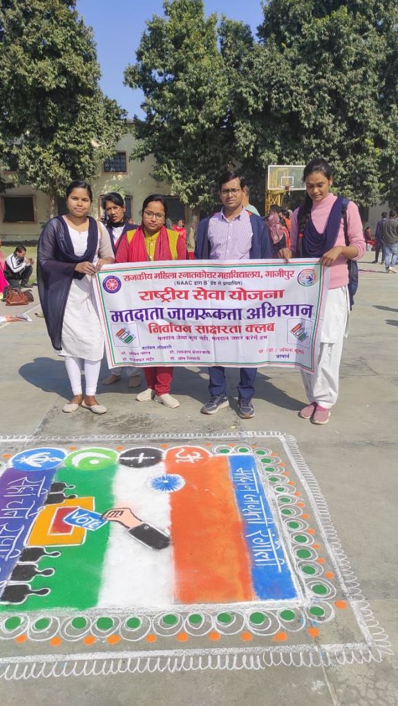 रैली के दौरान छात्राओं ने मतदाता जागरूकता संबंधी तमाम नारे जैसे – वोट डालने जाना है, अपना फर्ज निभाना है । वोट जैसा कुछ नहीं, वोट जरुर डालेंगे हम – आदि लगाकर लोगों को मतदान के प्रति जागरूक किया । तत्पश्चात स्वयंसेवी छात्राओं ने पीजी कॉलेज गाजीपुर में जिला प्रशासन द्वारा आयोजित मतदाता जागरूकता संबंधी रंगोली प्रतियोगिता में प्रतिभाग किया। प्रतियोगिता में छात्राओं द्वारा बनाए गए रंगोली को जिलाधिकारी द्वारा सराहा गया । तत्पश्चात महाविद्यालय वापस पहुंचकर स्वयंसेवी छात्राओं ने सूक्ष्म जलपान ग्रहण किया ।