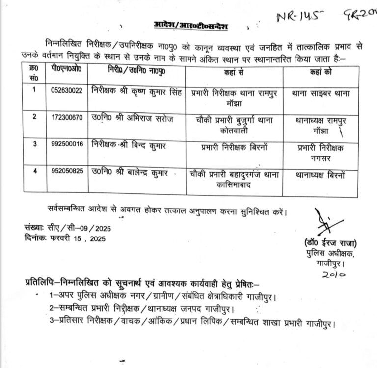 गाजीपुर। कानून व्यवस्था को चुस्त दुरुस्त रखने के लिए पुलिस अधीक्षक डॉ ईरज राजा ने शनिवार को चार थानाध्यक्षों का स्थानान्तरण किया।