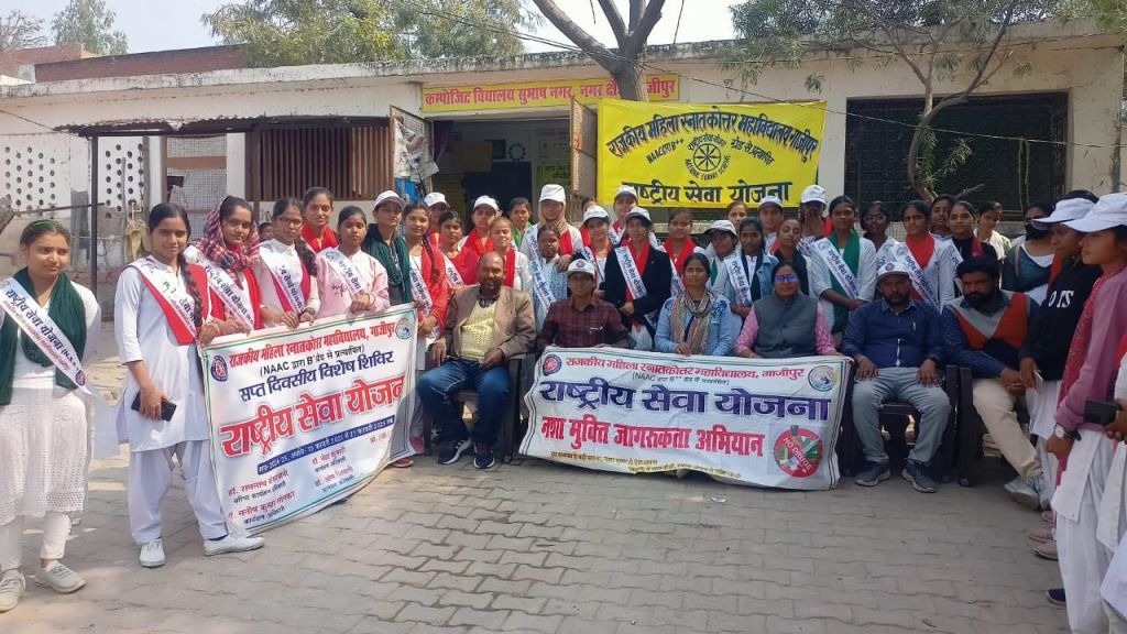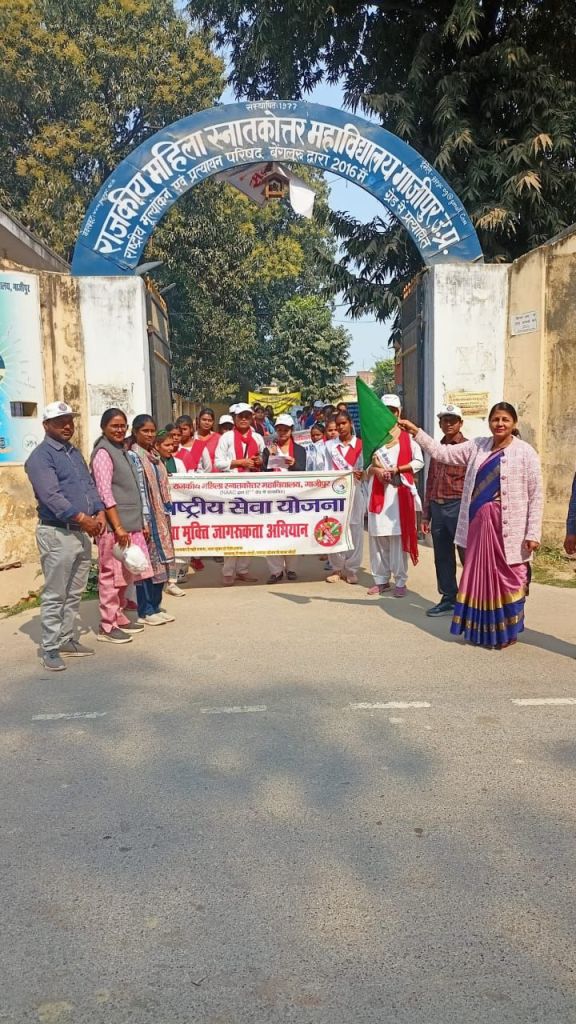 गाजीपुर। राष्ट्रीय सेवा योजना, राजकीय महिला स्नातकोत्तर महाविद्यालय के सप्त दिवसीय शिविर के चौथे दिन मंगलवार को नशा मुक्ति जागरूकता अभियान से संबंधित एक रैली आमघाट कोयला घाट कलेक्टर घाट से होते हुए सुभाष नगर तक निकाली गई। रैली को प्राचार्य प्रो. अनिता कुमारी ने झंडी दिखाकर रवाना किया । रैली के दौरान स्वयंसेवी छात्राओं ने नशा मुक्ति संबंधी नारे जैसे… जन-जन ने ठाना है नशे को मिटाना है, घर परिवार बचाना है नशा मुक्ति अपनाना है – आदि लगाए । साथ ही वरिष्ठ कार्यक्रम अधिकारी डॉ रामनाथ केसरवानी के निर्देशन में स्वयंसेवी छात्राओं कशिश कुशवाहा, श्रुति राय, संजू कुशवाहा, सौम्या सिंह चौहान आदि ने डोर टू डोर कैंपेन के माध्यम से सुभाष नगर में लोगों को धूम्रपान, गुटका, तंबाकू शराब आदि से होने वाली गंभीर बीमारियों को लेकर जागरूक किया व नशा छोड़ने का आग्रह किया।
