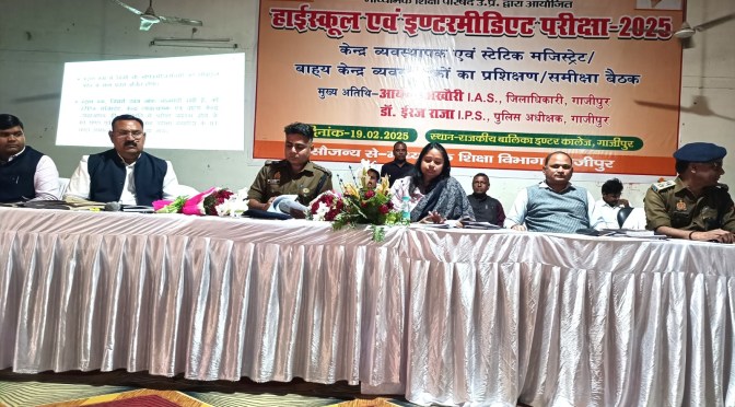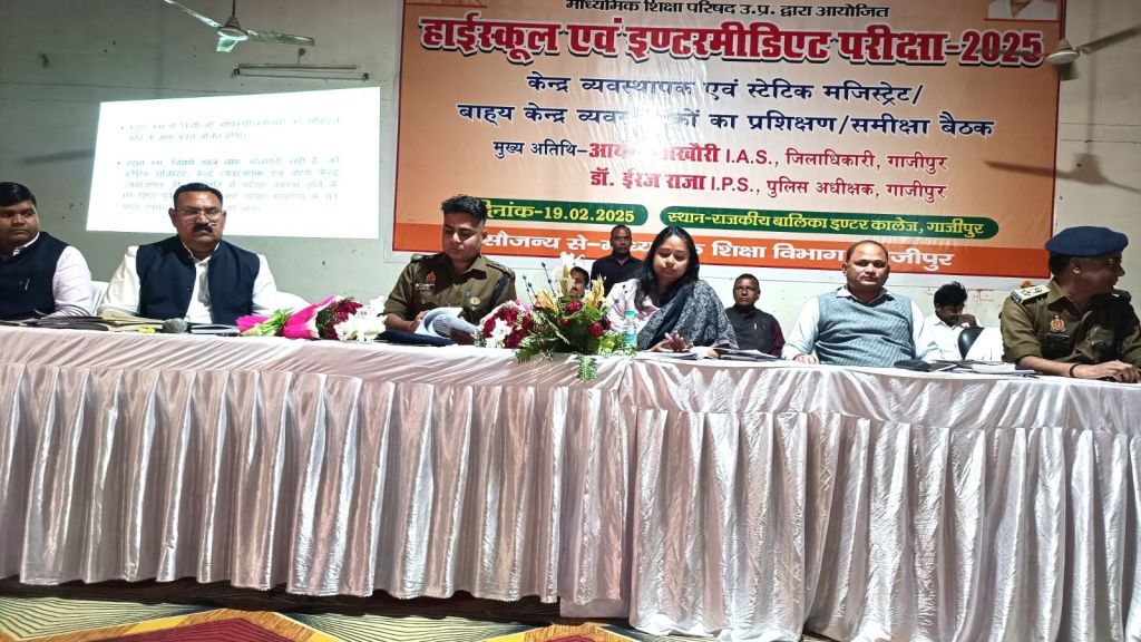 गाज़ीपुर। जिलाधिकारी आर्यका अखौरी की अध्यक्षता एवं पुलिस अधीक्षक डा0 ईरज राजा की उपस्थिति में माध्यमिक शिक्षा परिषद द्वारा आयोजित होने वाली हाई स्कूल एंव इण्टरमीडिएट परीक्षा को नकल विहीन एवं सुचितापूर्ण सम्पन्न कराने के सम्बन्ध मे बैठक/प्रशिक्षण बुधवार को राजकीय बालिका इण्टर कालेज महुआबाग के सभागार मे सम्पन्न हुई। बैठक मे जिलाधिकारी ने बताया कि परीक्षा 24 फरवरी, 2025 से प्रारम्भ होकर 12 मार्च, 2025 तक संचालित होगी। उन्होने समस्त सम्बन्धित अधिकारियों को निर्देश देते हुए कहा कि माध्यमिक शिक्षा परिषद द्वारा प्रेषित प्रश्नपत्रों को प्राप्त करने, उन्हे पुलिस अभिरक्षा मे सुरक्षित स्थान पर सी0सी0टी0बी के निगरानी मे रखना, प्रश्नपत्रो को परीक्षा केन्द्रो पर डबल लाक वाले स्टील/लोहे की आलमारी मे रखा जाये। प्रश्नपत्रों को परीक्षा केन्द्र पर पहुचने पर डबल लाक की आलमारी मे जिला मजिस्ट्रेट द्वारा नामित स्टैटिक मजिस्ट्रेट, केन्द्र व्यवस्थापक एवं वाह्य केन्द्र व्यवस्थापक की उपस्थिति मे परीक्षा केन्द्रो पर रखवाया जाय तथा डबल लाक वाली आलमारी मे पेपर सील से बंद किया जाय।