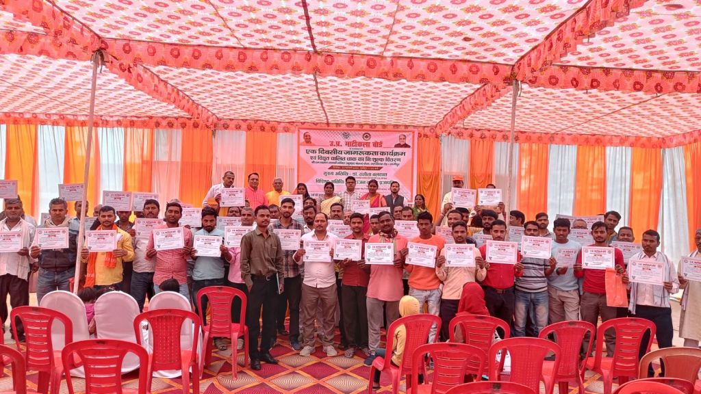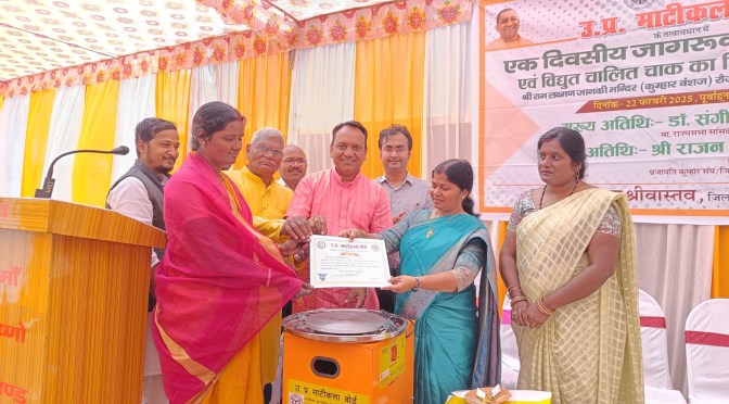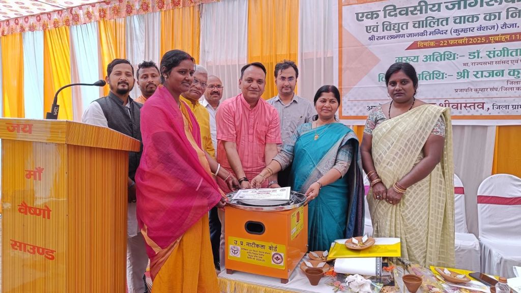 गाजीपुर।उ०प्र० खादी तथा ग्रामोद्योग बोर्ड के माध्यम से उ०प्र० माटीकला बोर्ड समन्वित विकास कार्यक्रम अन्तर्गत माटीकला टूल्स किट्स वितरण योजनान्तर्गत वर्ष 2024-25 में माटीकला से संबंधित प्रजापति समाज के 50 परम्परागत कारीगरों का निःशुल्क विद्युत चाक का वितरण एवं एक दिवसीय जागरूकता शिविर कार्याक्रम का आयोजन डा. संगीता बलवंत राज्यसभा सांसद एवं पूर्व मंत्री उ०प्र०, सरकार के द्वारा शनिवार को स्थान श्री राम लक्ष्मण जानकी मन्दिर (कुम्हार वंशज) के प्रांगण में ग्रा०पो०-रौजा जल निगम रोड जन०-गाजीपुर में किया गया। जिसमें मुख्यमंत्री माटीकला रोजगार योजना, माटीकला पुरस्कार योजना एवं माटीकला कॉमन फेसिलिटी सेन्टर के बारे में विस्तृत रूप से जानकारी प्रदान किया गया।