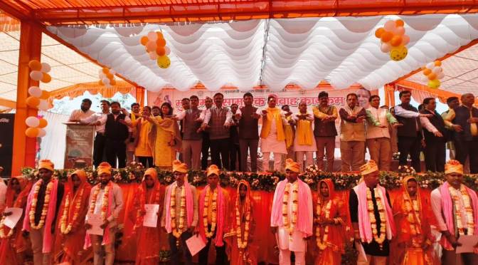 जिला विकास अधिकारी सुभाष चन्द्र सरोज ने नव विवाहित वर-वधुओ को आर्शिवचन देते हुए कहा कि नव विवाहित जोड़ो ने 7 फेरे लेकर एक साथ रहने का जो संकल्प लिया है उसे आजीवन निर्वहन करे। उन्होने कहा कि मुख्यमंत्री सामूहिक विवाह कार्यक्रम योजना एक कल्याणकारी योजना है। जिसमे हजारो हजार की संख्या में बेटियों के हाथ पीले किए जा चुके है। मुख्यमंत्री ने इस योजना के माध्यम से गरीब, मजदूर एवं असहाय परिवारो को इसका लाभ दिया है और आगे भी इस योजना के माध्यम से बेटियो का विवाह सम्पन्न कराया जाएगा। मुख्यमंत्री जी ने बेटियो के हाथ पीले करने का जो संकल्प लिया है उसे आगे और भी बेहतर बनाने का प्रयास किया जा रहा है। उन्होने कहा कि इस योजना के माध्यम से जो विवाह कराया जाता है उससे समाज मे फैली दहेज प्रथा जैसी रूढ़िवादी सोच समाप्त होती जा रही है। दहेज लेना और दहेज देना एक दण्डनीय अपराध है। उन्होने कहा कि आज जो भी बेटियां अपने ससुराल विदा हो रही है तो उनके ससुराल पक्ष के लोग उन्हे बहु न बल्कि बेटी बनाकर घर ले जाए। मिल बाट कर एक सादगी से भरे इस कार्यक्रम में परिणय सुत्र मे बध जाए और दहेज प्रथा तथा बेटियों को बोझ समझने की सोच से उबरकर, हम आगे बढ सके तथा बेटियों को समाज में उनको उचित स्थान दे सके। यही मुख्यमंत्री की मंशा है। बेटिया अपने समाज मे स्वावलंबी बने, उनकी शिक्षा, स्वास्थ्य सब उत्तम हो, इसी उद्देश्य से मुख्यमंत्री जी ने बेटियो के लिए कई योजनाए संचालित की है आप सभी योजनाओ से जुड़कर अपनी बेटियो को सशक्त बनाए। उन्होने सभी नव दाम्पय से निवेदन किया कि शादी के बाद गर्भ का भ्रूण परिक्षण न कराए जो भी बच्चा हो उसे सम्मान के साथ परिवार मे लाए।