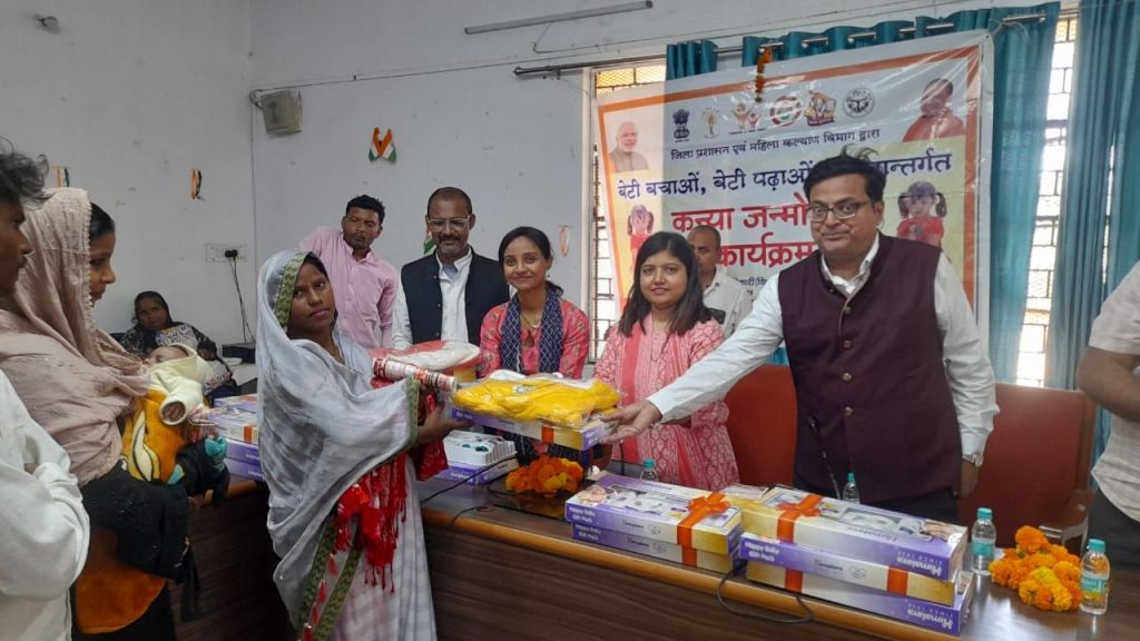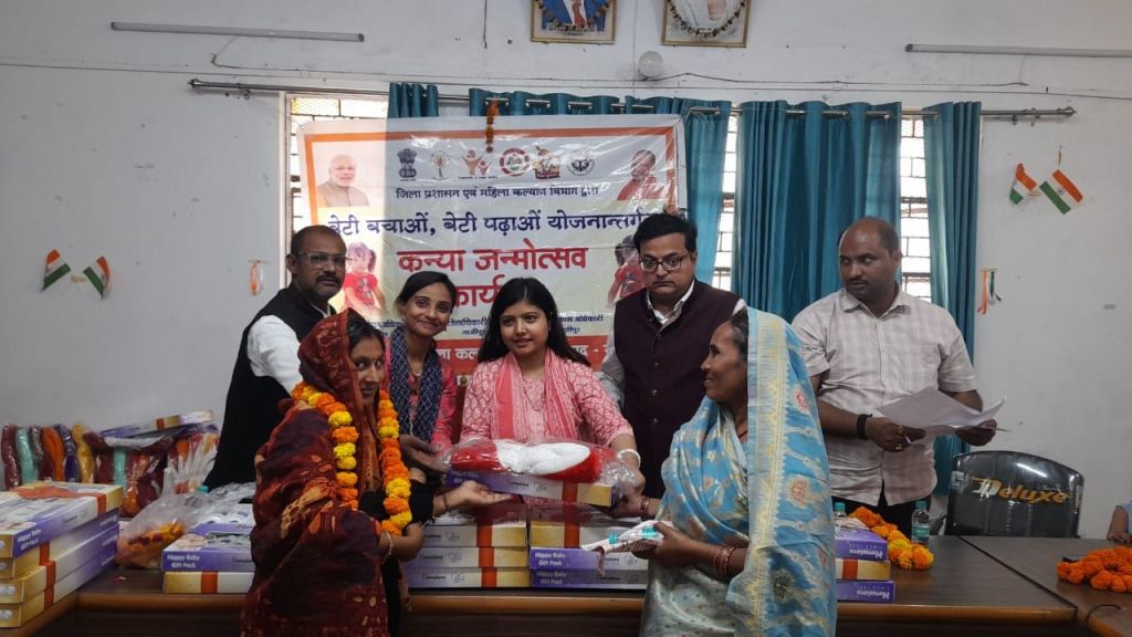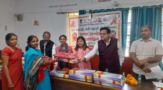 गाजीपुर।महिला कल्याण विभाग उत्तर प्रदेश भारत संचालित बेटी बचाओ,बेटी पढ़ाओ योजना के 10 वर्ष पूर्ण होने तथा अंतर्राष्ट्रीय महिला दिवस के उपलक्ष्य में जिलाधिकारी आर्यका अखौरी के निर्देश के क्रम में मंगलवार को मोहम्मदाबाद तहसील सभागार में कन्या जन्मोत्सव का आयोजन किया गया। जिसमें 40 नवजात बच्चियों के जन्म की खुशी मनाते हुए उनको बधाईयां दी गई। उप-जिलाधिकारी मोहम्मदाबाद डा. हर्षिता तिवारी द्वारा बेटियों के उज्जवल भविष्य की कामना करते हुए उनको अच्छे से पालन पोषण देने के साथ उनको शिक्षित कर आत्म निर्भर बनाने हेतु बच्चियों के परिजनों को प्रेरित करते हुए उनकी माताओं को उपहार स्वरूप बेबी किट एवं तौलिया का वितरण किया गया । इसके साथ ही बच्चियों को शासन द्वारा संचालित कन्या सुमंगला योजना के बारे में जानकारी दी गई । इस अवसर पर मुहम्दाबाद सामुदायिक स्वास्थ केंद्र अधीक्षक डॉ० आशीष राय, ब्लॉक प्रोग्राम मैनेजर संजीव कुमार, वन स्टॉप सेंटर मैनेजर प्रियंका प्रजापति, चाइल्ड लाइन कोऑर्डिनेटर संतोष कुमार सिंह व आशा आदि उपस्थित रहे।