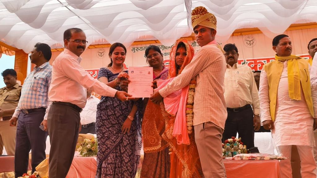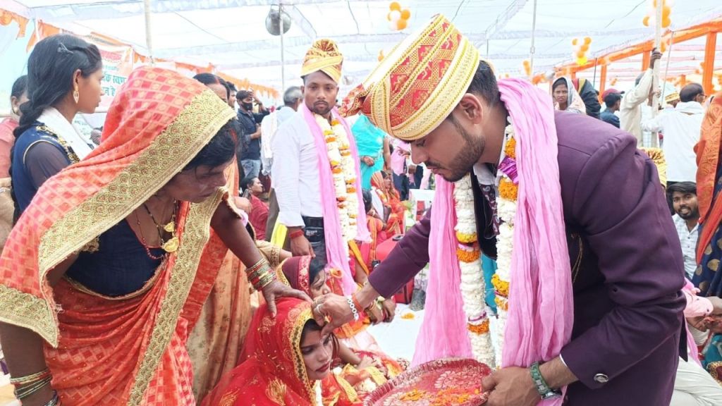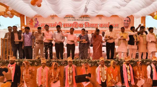 मुख्य अतिथि जिला पंचायत अध्यक्ष सपना सिंह ने नव विवाहित वर-वधुओ को आर्शिवचन देते हुए कहा कि नव विवाहित जोड़ो ने 7 फेरे लेकर एक साथ रहने का जो संकल्प लिया है उसे आजीवन निर्वहन करे। उन्होने कहा कि मुख्यमंत्री सामूहिक विवाह कार्यक्रम योजना एक कल्याणकारी योजना है। जिसमे हजारो हजार की संख्या में बेटियों के हाथ पीले किये जा चुके है। मुख्यमंत्री जी ने इस योजना के माध्यम से गरीब, मजदूर एवं असहाय परिवारो को इसका लाभ दिया है और आगे भी इस योजना के माध्यम से बेटियो का विवाह सम्पन्न कराया जाएगा।मुख्यमंत्री ने बेटियो के हाथ पीले करने का जो संकल्प लिया है उसे आगे और भी बेहतर बनाने का प्रयास किया जा रहा है। उन्होने कहा कि इस योजना के माध्यम से जो विवाह कराया जाता है उससे समाज मे फैली दहेज प्रथा जैसी रूढ़िवादी सोच समाप्त होती जा रही है। दहेज लेना और दहेज देना एक दण्डनीय अपराध है। उन्होने कहा कि आज जो भी बेटियां अपने ससुराल विदा हो रही है तो उनके ससुराल पक्ष के लोग उन्हे बहु न बल्कि बेटी बनाकर घर ले जाए। मिल बाट कर एक सादगी से भरे इस कार्यक्रम में परिणय सुत्र मे बध जाये और दहेज प्रथा तथा बेटियों को बोझ समझने की सोच से उबरकर, हम आगे बढ सके तथा बेटियों को समाज में उनको उचित स्थान दे सके। यही मुख्यमंत्री जी की मंशा है। बेटिया अपने समाज मे स्वावलंबी बने, उनकी शिक्षा, स्वास्थ्य सब उत्तम हो, इसी उद्देश्य से मुख्यमंत्री ने बेटियो के लिए कई योजनाए संचालित की है आप सभी योजनाओ से जुड़कर अपनी बेटियो को सशक्त बनाए। उन्होने सभी नव दाम्पय से निवेदन किया कि शादी के बाद गर्भ का भ्रूण परिक्षण न कराये जो भी बच्चा हो उसे सम्मान के साथ परिवार मे लाए। अध्यक्ष नगर पालिका परिषद सरिता अग्रवाल ने सामूहिक विवाह के सफल आयोजन पर आभार व्यक्त करते हुए विवाहित नव दाम्पत्य जोड़ो को उनके विवाहित जीवन के लिए शुभकामनाए दी। उन्होने कहा कि मुख्यमंत्री की प्रेरणा से बेटियों को बोझ समझने की जो एक मंशा या सोच रहती है, उन सभी कुरीतियों पर एक प्रहार है यह सामूहिक विवाह कार्यक्रम। मिल बाट कर एक सादगी से भरे इस कार्यक्रम में परिणय सुत्र मे बध जाये और दहेज प्रथा तथा बेटियों को बोझ समझने की सोच से उबरकर, हम आगे बढ सके तथा बेटियों को समाज में उनको उचित स्थान दे सके यही मुख्यमंत्री जी की मंशा है।