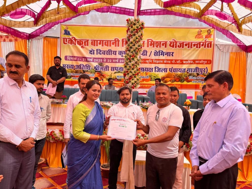 गाजीपुर।एकीकृत बागवानी विकास मिशन योजनान्तर्गत वर्ष 2024-25 में दो दिवसीय गोष्ठी का उद्घाटन शुक्रवार को मुख्य अतिथि जिला पंचायत अध्यक्ष सपना सिंह द्वारा दीप प्रज्जवलन कर किया। गोष्ठी/सेमिनार में उपस्थित कृषि विज्ञान केन्द्र, पी०जी० कालेज के वैज्ञानिक डा० वी०के० सिंह ने औद्यानिक फसलों, फलों, सब्जियों को उगाने तथा रख-रखाव के बारे में विस्तार से बताया गया। वैज्ञानिक विधि से शाकभाजी की खेती, ड्रेगन फ्रूट, जैविक सब्जी खेती उत्पादन तथा निर्यात करने के मापदंड सब्जी उत्पादन पर व्याख्यान दिया गया। उपस्थित कृषकों से फल एवं सब्जियों की खेती में तकनीकी अपनाकर लागत को कम एवं आय को अधिक करने के लिए कृषकों से आह्वान किया। डा० ओमकार सिंह, वैज्ञानिक, कृषि विज्ञान केन्द्र, पी०जी० कालेज द्वारा बागवानी फसलों की जैविक खेती एवं अधिक से अधिक फलोत्पादन तथा संरक्षित खेती (पॉली हाउस/ग्रीन हाउस) के विषय में कृषकों को विस्तृत जानकारी दी गई। डा० शशांकशेखर सिंह, वैज्ञानिक कृषि विज्ञान केन्द्र, आंकुशपुर के द्वारा उपस्थित कृषकों के मध्य वैज्ञानिक विधि से मशरूम उत्पादन तथा मधुमक्खी पालन एवं उससे होने वाली आय के बारे में विस्तार से व्याख्यान दिया गया। डा० रागिनी दूबे, वैज्ञानिक, कृषि विज्ञान केन्द्र, पी०जी०कालेज द्वारा औद्यानिक फसलों में लगने वाले रोग एवं कीट पतंगों की रोकथाम के बारे में, पुराने हो चुके बागों के जीर्णाेद्धार करके पुनः फलोत्पादन प्राप्त करने की तकनीकी के विषय में कृषकों को अवगत कराया। डा० रामकुमार राय, प्रगतिशील कृषक के द्वारा मृदा नमूना एवं मृदा परीक्षण के विषय में विस्तृत जानकारी दी गयी। उप कृषि निदेशक, द्वारा प्रधानमंत्री किसान सम्मान निधि एवं प्रधानमंत्री कृषि सिंचाई योजनान्तर्गत ड्रीप, मिनी स्प्रिंकलर एवं पोर्टबल स्प्रिंकलर के उपयोग एवं उसके लाभ तथा अन्य योजनाओं के विषय में विस्तार से जानकारी दी गयी। आशीष कुमार, जिला उद्यान अधिकारी द्वारा उद्यान विभाग अन्तर्गत संचालित सभी योजनाओं के बारे में कृषकों को अवगत कराया गया। अन्त में कार्यक्रम की मुख्य अतिथि सपना सिंह जिला पंचायत अध्यक्ष द्वारा गोष्ठी में लगे स्टालों को उत्कृष्ट स्टॉल के पुरस्कार से पुरस्कृत किया गया।जिसमें प्रथम पुरस्कार के रूप में सुसुण्डी फॉर्मर प्रोड्यूसर कम्पनी लि० सुसुण्डी, द्वितीय पुरस्कार के रूप में जिला कार्यक्रम विभाग तथा तृतीय पुरस्कार के रूप में मेसर्स जैन इरिगेशन प्रा०लि० को दिया गया।