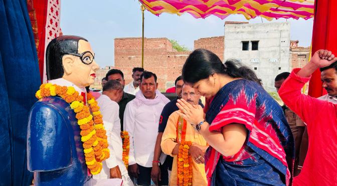 ग़ाज़ीपुर।सदर विधानसभा के ग्राम हेतिमपुर में बूथ संख्या 159 पर राज्यसभा सांसद डा. संगीता बलवंत ने भाजपा पदाधिकारी एवं कार्यकर्ताओं के साथ भारत रत्न डा. भीमराव अंबेडकर की प्रतिमा पर माल्यार्पण कर बाबा साहब की जयंती मनाई ।