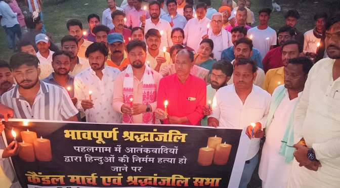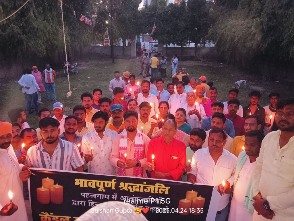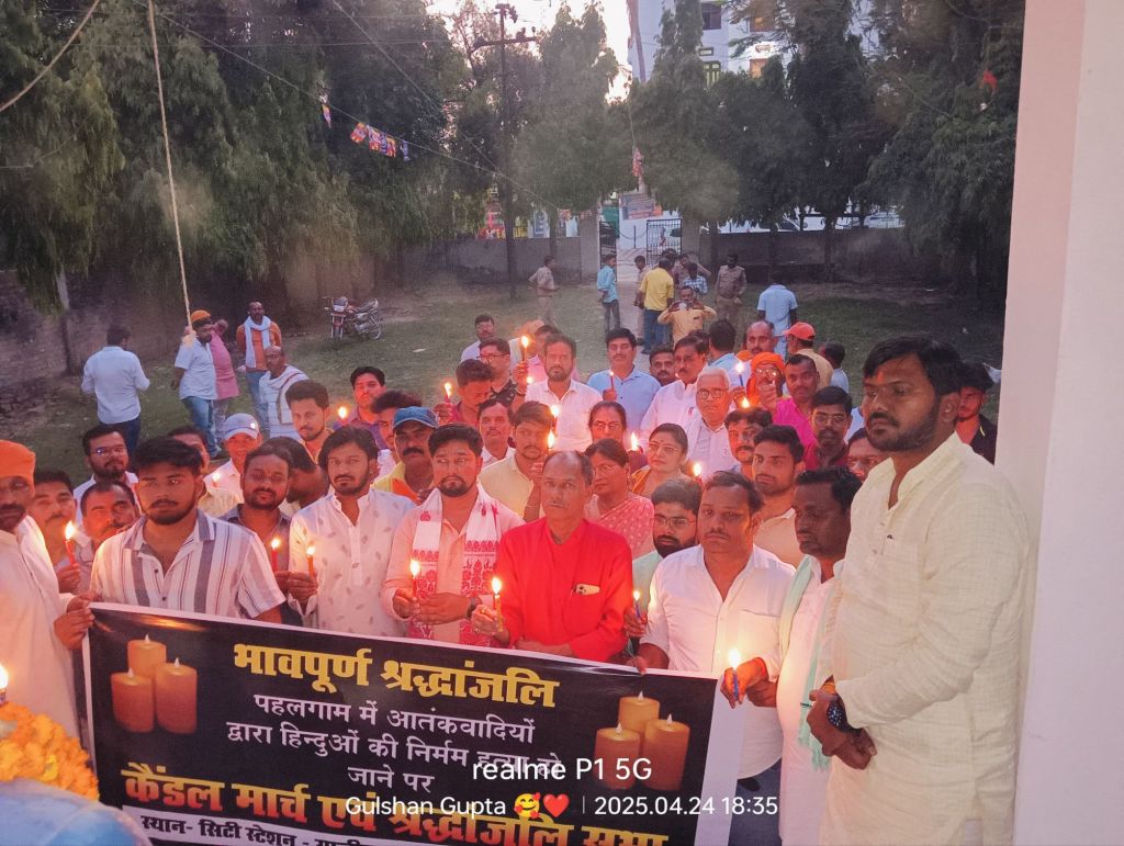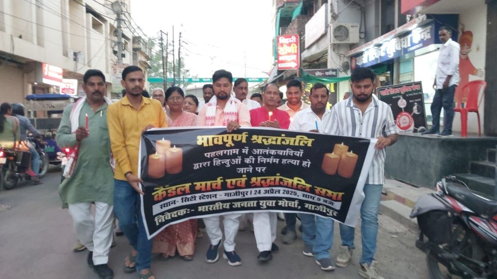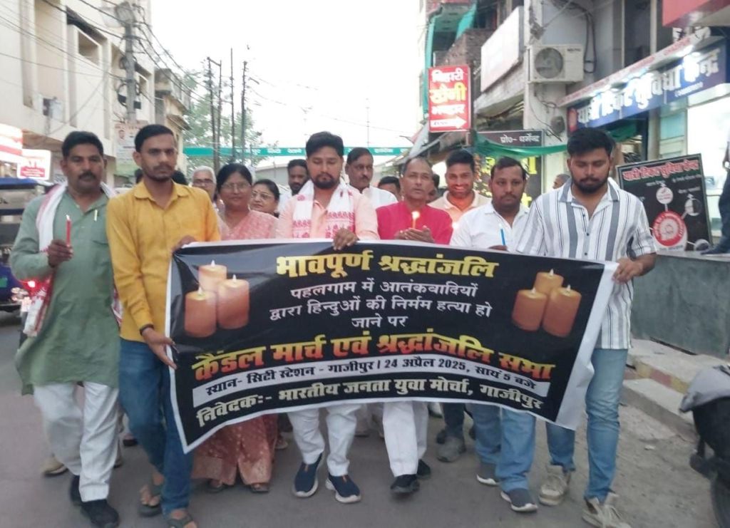 गाजीपुर।पहलगांव आतंकी हमले में लक्ष्य करके मारे गए लोगों को श्रद्धांजलि देने हेतु भारतीय जनता युवा मोर्चा (भाजयुमो)के नेतृत्व में गुरुवार को शाम सिटी स्टेशन से कैंडल मार्च का आयोजन किया गया। यह मार्च गाजीपुर सिटी रेलवे स्टेशन से प्रारंभ होकर लंका स्थित अंबेडकर पार्क तक निकाला गया। जहाँ घटना में मारे लोगों को श्रद्धांजलि तथा घायलों के शीघ्र स्वस्थ होने की प्रार्थना की गई।