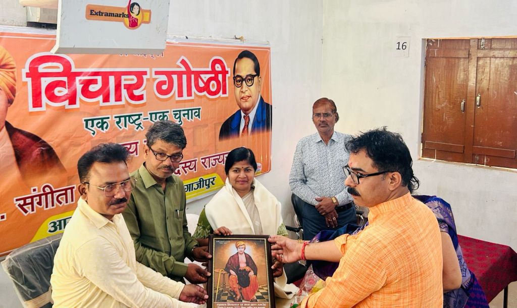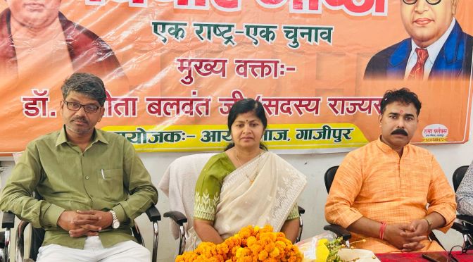 ग़ाज़ीपुर।DAV कालेज चीतनाथ द्वारा एक राष्ट्र एक चुनाव पर विचार गोष्ठी का आयोजन किया गया । मुख्य अतिथि राज्यसभा सांसद डा.संगीता बलवंत ने इस विषय पर अपने विचार व्यक्त किए और एक राष्ट्र-एक चुनाव की उपयोगिता पर चर्चा की । कार्यक्रम की शुरुआत दीप प्रज्वलित करके की गई।राज्यसभा सांसद डा. संगीता बलवंत ने बताया कि एक राष्ट्र, एक चुनाव भारत सरकार द्वारा देश में सभी चुनावों को एक ही दिन या एक विशिष्ट समय सीमा के भीतर समन्वित करने के लिए विचाराधीन एक प्रस्ताव है, जिसका उद्देश्य चुनाव लागत में कटौती करना है।
