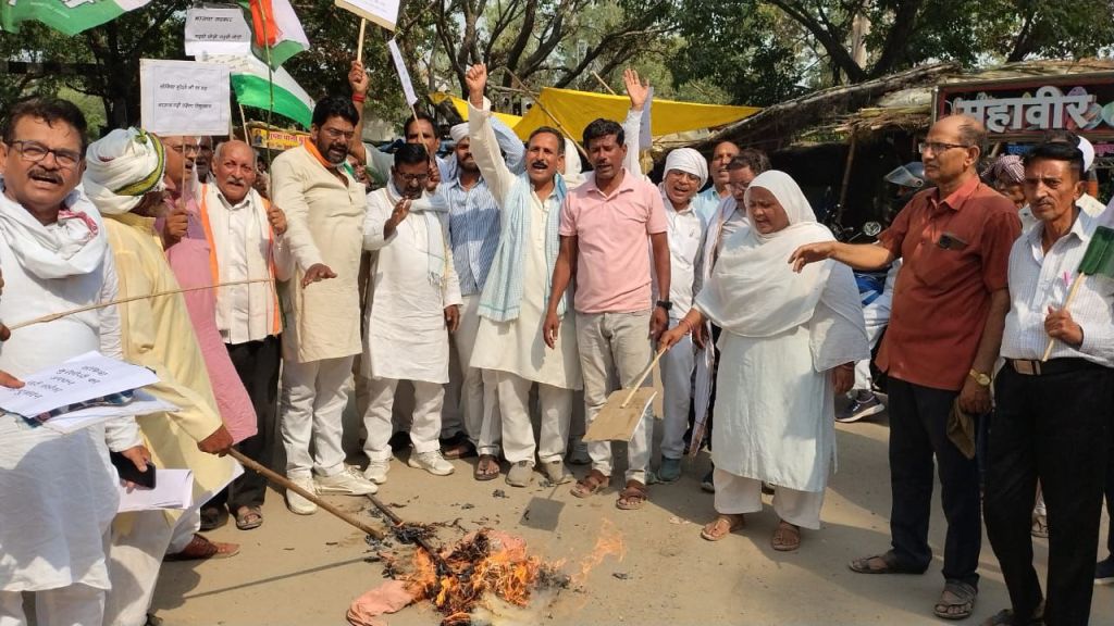 जिला कांग्रेस ने जखनियां तहसील में प्रदर्शन के दौरान मंत्री का फूंका पुतला और जमकर की नारेबाजी, जिलाध्यक्ष सुनील राम भी रहे मौजूद।
