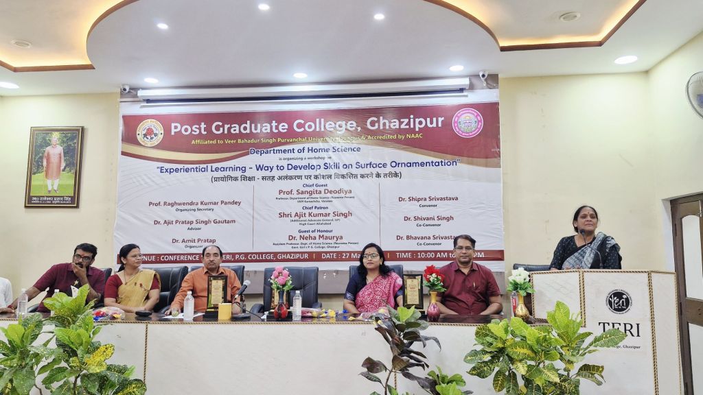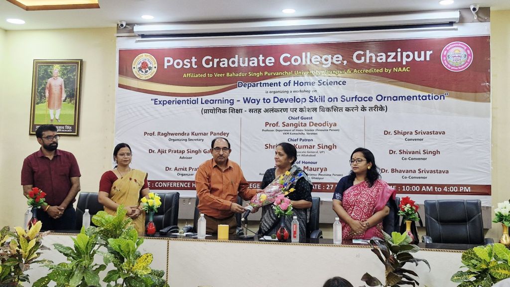 ग़ाज़ीपुर। पीजी कॉलेज के सभागार में गृह विज्ञान विभाग की ओर से “अनुभवात्मक शिक्षण: सतह अलंकरण पर कौशल विकास” विषय पर रोजगार उन्मुख कार्यशाला का आयोजन मंगलवार को किया गया। इसमें स्टेंसिल छपाई और टाई एंड डाई की तकनीकों का प्रशिक्षण दिया गया। कार्यशाला में पीजी कॉलेज, राजकीय महिला महाविद्यालय, स्वामी सहजानंद स्नातकोत्तर महाविद्यालय सहित अन्य कॉलेजों की छात्राओं, शोध छात्राओं और शिक्षकों ने भाग लिया।