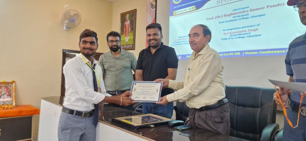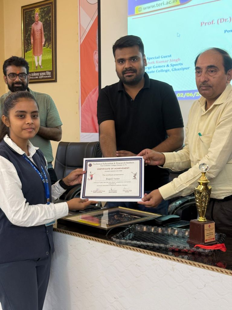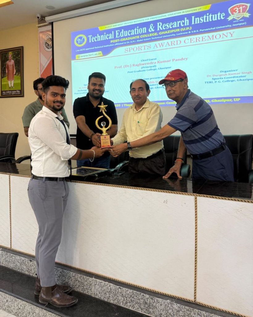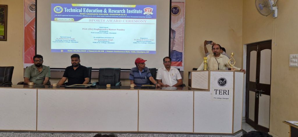 गाजीपुर। गोराबाजार स्थित तकनीकी शिक्षा एवं शोध संस्थान (टेरी), पी.जी. कॉलेज के सभागार में सोमवार को “स्पोर्ट्स अवार्ड सेरेमनी” का सोमवार को भव्य आयोजन किया गया। यह कार्यक्रम विश्वविद्यालय के निर्देशों और भारत सरकार के “खेलो इंडिया” पहल के तहत आयोजित हुआ, जिसमें बैडमिंटन, क्रिकेट सहित विभिन्न खेलों के विजेता और उपविजेता प्रतिभागियों व टीमों ने हिस्सा लिया।