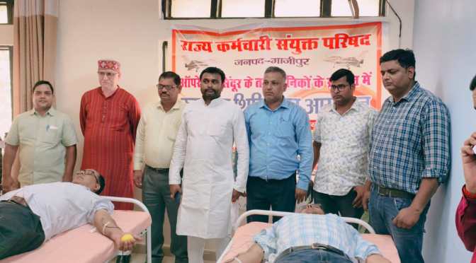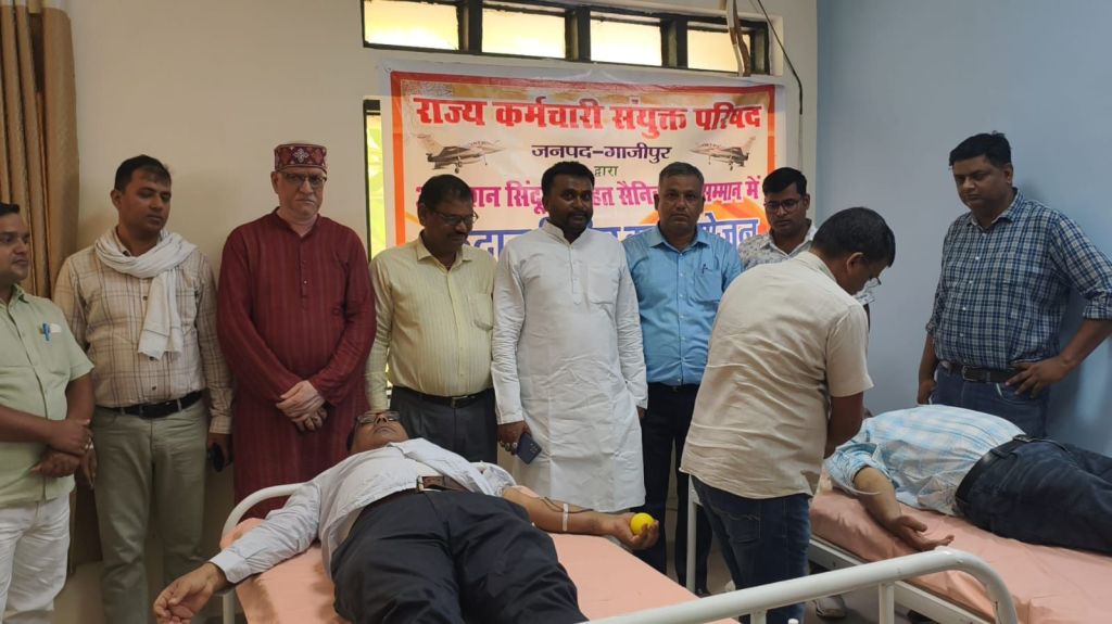 ग़ाज़ीपुर।9 जून 2025 को राज्य कर्मचारी संयुक्त परिषद के तत्वाधान में ऑपरेशन सिंदूर के तहत विकास भवन में रक्तदान शिविर का आयोजन किया गया।जिसमें डॉ के0 के0सिंह ब्लड बैंक प्रभारी द्वारा उद्घाटन किया गया।राज्य कर्मचारी संयुक्त परिषद के जिलाध्यक्ष द्वारा कहा गया कि ऑपरेशन सिंदूर के तहत जो पहलगाम में सुरक्षाकर्मी व आमजन घायल हुए थे,उनके इलाज मे मूलभूत सुविधा के देखते हुए जनपद गाजीपुर के कर्मचारी द्वारा रक्तदान किया गया है।रक्तदान करना एक पुनीत कार्य है,जिसमें हर स्वास्थ कर्मी को रक्तदान करना चाहिए, जिससे जरूरतमंद लोगों को बेहतर इलाज मिल सके,जिसमें बेसिक शिक्षापरिषद,युवाकल्याण,पशुपालन विभाग,आई,सी,डीएस,स्वास्थ्य विभाग,माध्यमिक,सिंचाई विभाग,के कर्मचारियों द्वारा रक्तदान किया। मुख्य चिकित्सा अधीक्षक राजेश सिंह द्वारा रक्तदान करने वाले कर्मियों को अवगत कराया के रक्तदान करने से इम्यूनिटी मजबूत होती है,स्वस्थ व्यक्ति को साल में एक बार ब्लड दान अवश्य करना चाहिए, उन्होंने राज्य कर्मचारी संयुक्त परिषद जिलाध्यक्ष दुर्गेश कुमार श्रीवास्तव का प्रति आभार व्यक्त किया। रक्तदान जैसा पुनीत कार्य के लिए विकास भवन मे शिविर लगा करके पूरे प्रदेश में यह एक अलग ही संदेश दिया गया है। संगठन सिर्फ,अपने मांग के लिए ही नहीं लड़ता है आवश्यकता पड़ने पर राष्ट्रहित के लिए हर स्तर पर सरकार के साथ तैयार हैं।