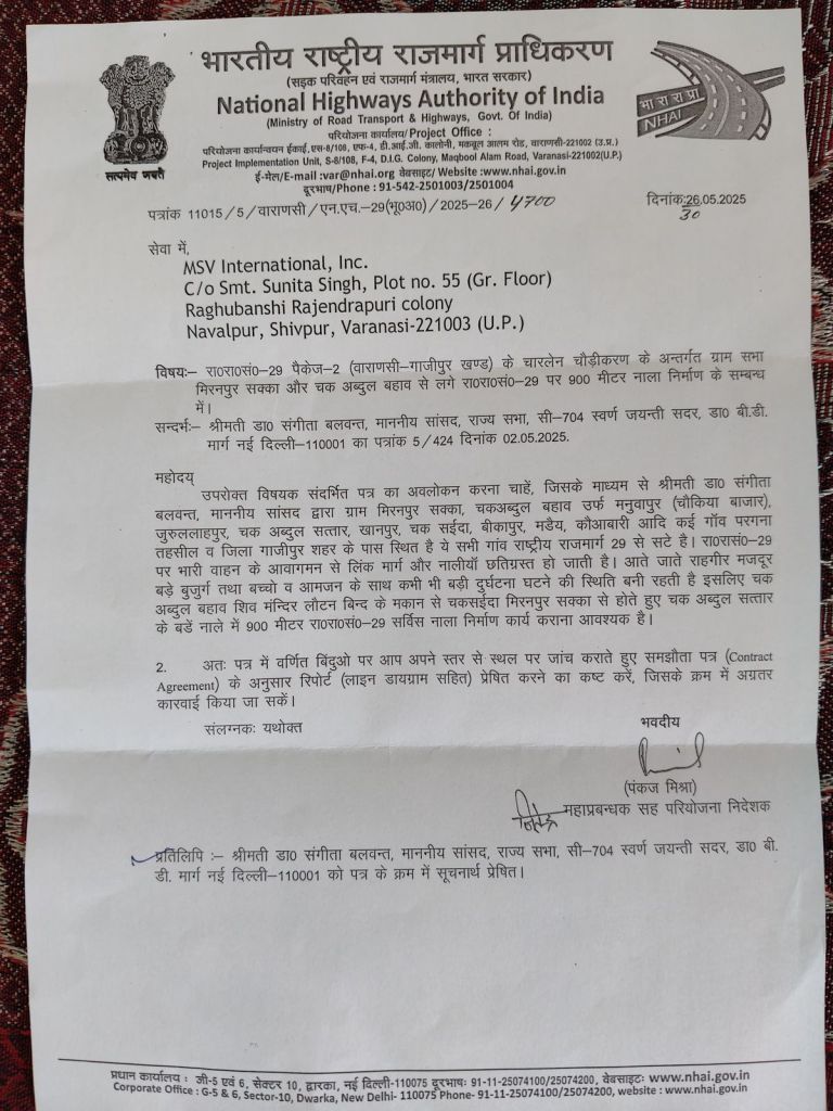 गाजीपुर। राज्यसभा सांसद डा. संगीता बलवंत की पहल पर ग्राम मीरनपुर सक्का में नाला निर्माण हेतु NHI द्वारा मांगा गया जाँच रिपोर्ट। इस संबंध में राज्यसभा सांसद ने बताया की गांव मीरनपुर सक्का एवं आस- पास के कई गांव जल भराव के समस्या से जूझ रहे हैं ।गाजीपुर-वाराणसी फोरलेन हाइवे से सटे होने के कारण मीरनपुर बाईपास से भारी वाहनों का आवागमन बहुत अधिक होता है जिससे बार- बार नाली टूट जाती है और जल जमाव की समस्या बनी रहती है। जिसके निदान के लिए मैंने भारतीय राष्ट्रीय राजमार्ग को मीरनपुर सक्का से चक अब्दुल सत्तार तक 900 मीटर सर्विस नाला निर्माण के लिए पत्र लिखा। तत्पश्चात मीरनपुर सक्का में नाला निर्माण हेतु NHI द्वारा MSV इटरनेशनल कंपनी द्वारा जाँच रिपोर्ट मांगा गया है । आशा है की जल्द ही समस्या से ग्रामवासियों को निजात मिलेगी।