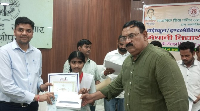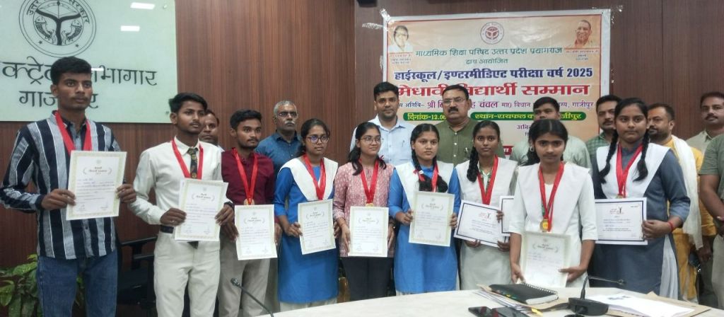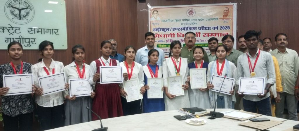 गाजीपुर। वर्ष 2025 में हाईस्कूल एवं इण्टरमीडिएट परीक्षा उत्तीर्ण मेधावी विद्यार्थियों को राज्य स्तर पर मुख्यमंत्री योगी आदित्यनाथ उत्तर प्रदेश सरकार द्वारा लोक भवन, लखनऊ में आयोजित कार्यक्रम में गुरुवार को सम्मानित किया गया। उक्त कार्यक्रम का लाइव प्रसारण किया गया। इसी क्रम में जनपद गाजीपुर के मेधावी विद्यार्थियों को सम्मानित करने हेतु राईफल क्लब, कलेक्ट्रेट सभागार में जिलाधिकारी अविनाश कुमार की अध्यक्षता में कार्यक्रम आयोजित किया गया। जिसमें लोक भवन, लखनऊ में आयोजित कार्यक्रम का विद्यार्थियों एवं अभिभावकों को सजीव प्रसारण को देखा एवं सुना गया। लोक भवन, लखनऊ में आयोजित कार्यक्रम सम्पन्न होने के पश्चात जिलाधिकारी तथा सदस्य विधान परिषद विशाल सिंह चंचल के प्रतिनिधि प्रदीप पाठक द्वारा मेधावी विद्यार्थियों को टेबलेट, पदक एवं प्रशस्ति पत्र प्रदान करते हुए सम्मानित किया गया। जिला विद्यालय निरीक्षक, गाजीपुर द्वारा सभी 20 मेधावी विद्यार्थियों के खाते में 21000(रु०-इक्कीस हजार मात्र) की धनराशि 12.06.2025 को अन्तरित कर दी गई। जिलाधिकारी एवं विधायक के प्रतिनिधि द्वारा सम्मानित होने वाले मेधावी विद्यार्थियों में कक्षा 10 के 09 छात्राएं एवं 01 छात्र तथा कक्षा-12 के 07 छात्राएं एवं 03 छात्र रहे। जनपद गाजीपुर की 02 छात्राओं ने हाईस्कूल की परीक्षा में राज्य स्तरीय मेरिट सूची में सातवां एवं नौवां स्थान प्राप्त किया है।