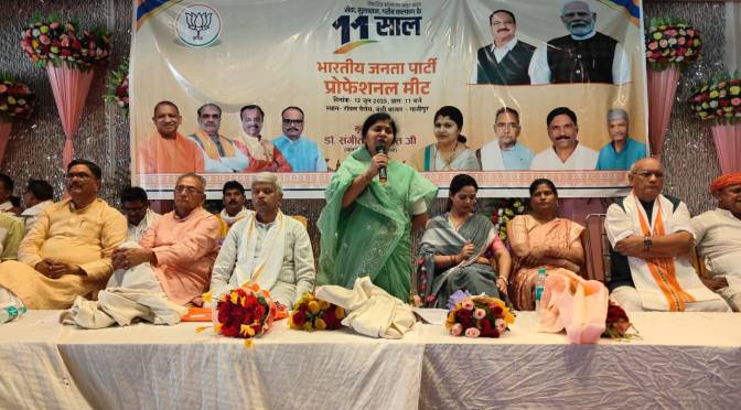 गाजीपुर। प्रधानमंत्री नरेंद्र मोदी के नेतृत्व में विकसित भारत का अमृत काल, सेवा सुशासन गरीब कल्याण के 11 वर्ष पूर्ण होने पर आज नगर के रायल पैलेस में प्रोफेशनल मीट का आयोजन जिलाध्यक्ष ओमप्रकाश राय की अध्यक्षता में किया गया। प्रोफेशनल मीट मे “सेवा, सुशासन एवं गरीब कल्याण”, “सशक्त भारत, सुरक्षित भारत” तथा विकसित भारत की संकल्पना एवं हमारी भूमिका विषय की संगोष्ठी मे समाज के प्रबुद्ध जनों ने भाग लिया। मुख्य अतिथि राज्यसभा सांसद डा. संगीता बलवंत ने विकसित भारत की संकल्पना एवं हमारी भूमिका पर बोलते हुए कहा कि 2014 मे भाजपा नेता नरेंद्र मोदी ने विकसित भारत का एक सपना देखा तथा प्रधानमंत्री बनने के बाद संकल्प लिया कि विकासशील भारत को विकसित भारत बनाकर रहूंगा। उसके प्रति लक्ष्य लेकर लगातार कार्य करना शुरू किया।