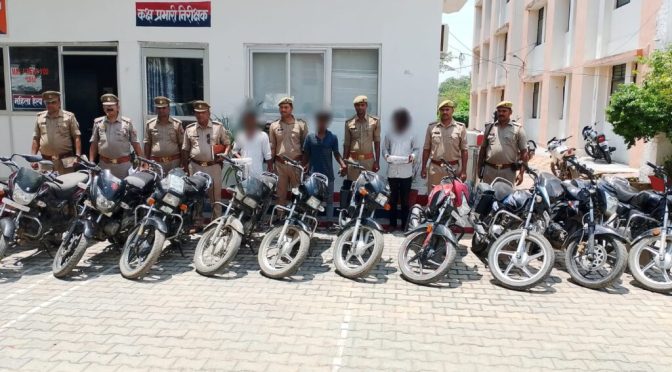 गाज़ीपुर। सदर कोतवाली पुलिस टीम ने गुरुवार को अन्तर्जनपदीय वाहन चोरी का पर्दाफाश करते हुए तीन शातिर चोरों को गिरफ्तार किया। पुलिस ने गिरफ्तार चोरों के कब्जे से चोरी की 11 मोटर साइकिल व दो देशी तमंचा 315 बोर मय जिंदा कारतूस बरामद किया है। बता दें कि पुलिस टीम ने मुखबिर की सूचना पर क्षेत्र के बिलैचिया मोड़ तिराहा के पास से तीन लोगों को गिरफ्तार किया। गिरफ्तार अभियुक्तों में बिट्टू कुमार पुत्र गुड्डू राम निवासी ग्राम बहलीपुर थाना सरायलखंसी जनपद मऊ, नफीस अंसारी पुत्र पप्पू अंसारी (मिस्त्री) निवासी शेखपुरा थाना कोतवाली गाजीपुर एवं रवि कुमार बिन्द पुत्र सिंहासन बिन्द निवासी ग्राम चकिया थाना सुहवल जनपद है। पुलिस ने उनके कब्जे से चोरी की दो मोटर साइकिल व अभियुक्त बिट्टू कुमार से एक तमंचा 315 बोर मय जिंदा कारतूस व अभियुक्त रवि बिन्द से एक तमंचा मय जिंदा कारतूस .315 बोर बरामद किया। पूछताछ में अभियुक्तों द्वारा बताया गया कि हम लोग योजना बनाकर गाजीपुर, जौनपुर, वाराणसी, बलिया, आजमगढ़ और बिहार में भी जाकर मोटर साइकिल की चोरी करते हैं। सुरक्षा के लिये तमंचा भी रखते हैं। हमने कई मोटर साइकिलों की चोरी किया है और मोटर साइकिलों को बेचकर अपना खर्च चलाते हैं। इसके साथ ही अभियुक्तों द्वारा चोरी की अन्य नौ मोटर साइकिल अंधऊ हवाईपट्टी के पास के भिन्न भिन्न स्थान से बरामद कराया। इसके सम्बन्ध मे थाना पर मुकदमा पंजीकृत कर विधिक कार्यवाही की गयी। अभियुक्तों की गिरफ्तारी व बरामदगी करने वाली पुलिस टीम में कोतवाली प्रभारी दीन दयाल पाण्डेय के साथ कोतवाली पुलिस टीम शामिल रहे।