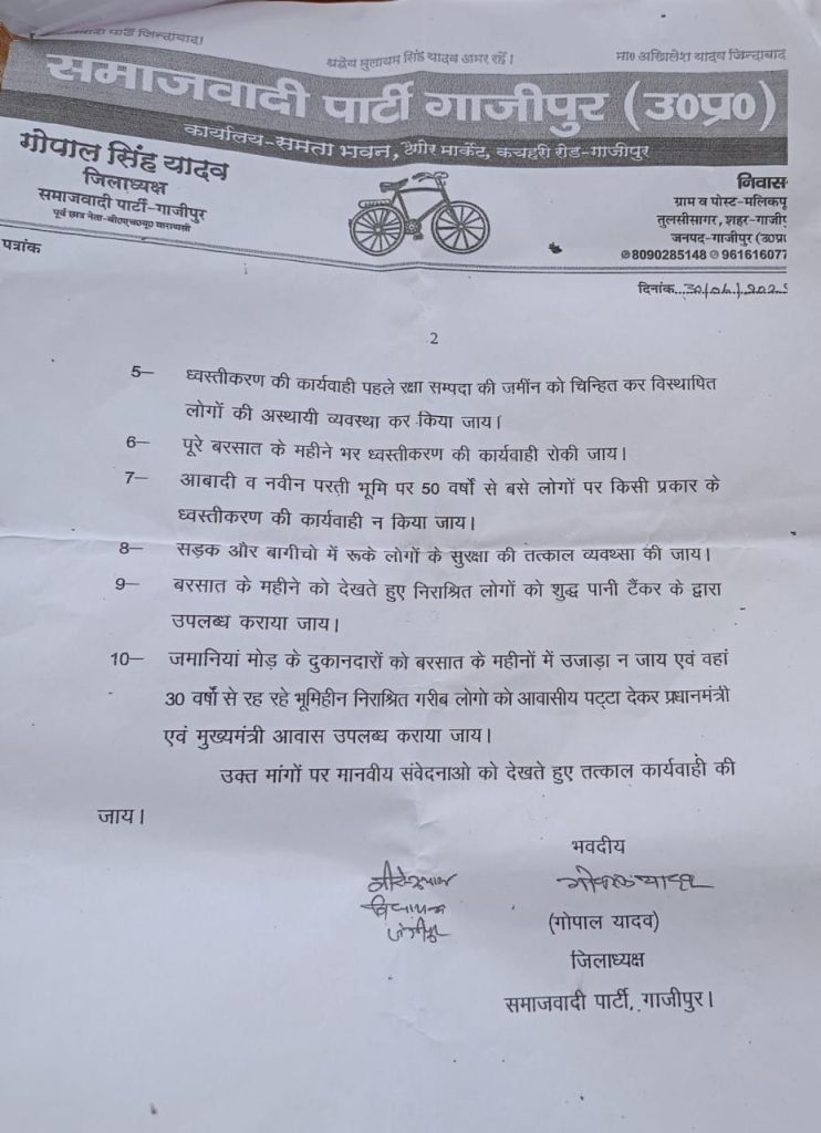 गाज़ीपुर।सोमवार को समाजवादी पार्टी का एक प्रतिनिधिमंडल जिलाध्यक्ष गोपाल यादव के नेतृत्व में इनरवां,बिलाईच गांव में शासन प्रसाशन के द्वारा किए गए ध्वस्तीकरण की कार्रवाई एवं उजाड़े गए गरीबों को न्याय दिलाने के सवाल पर जिलाधिकारी अविनाश कुमार को दस सूत्रीय ज्ञापन सौंपा।