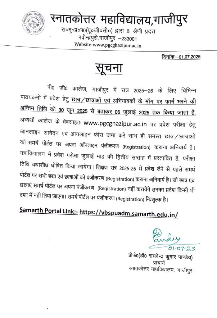 गाजीपुर। स्नातकोत्तर महाविद्यालय में स्नातक एवं स्नातकोत्तर पाठ्यक्रमों के सभी विषयों में प्रवेश परीक्षा के लिए ऑनलाइन प्रवेश परीक्षा हेतु आवेदन फार्म भरें जाने की तिथि 6 जुलाई 2025 कर दी गयी है। प्रवेश परीक्षा फॉर्म के सम्बन्ध में प्राचार्य प्रोफे० (डॉ०) राघवेन्द्र कुमार पाण्डेय ने बताया कि महाविद्यालय में आगामी सत्र: 2025-26 में प्रवेश लेने के लिए प्रतीक्षारत छात्र- छात्राओं के लिए अपना प्रवेश परीक्षा आवेदन फार्म स्नातकोत्तर महाविद्यालय की वेबसाइट : http://www.pgcghazipur.ac.in पर 30 जून 2025 तक भरने की समय सीमा को छात्र- छात्राओं एवं अभिभावकों की मांग पर 30 जून से बढ़ा कर 6 जुलाई 2025 कर दी गयी है। अब छात्र-छात्राओं को फॉर्म भरने के लिए 6 जुलाई 2025 तक कॉलेज की वेबसाइट पर आवेदन करने का विकल्प मिलेगा।