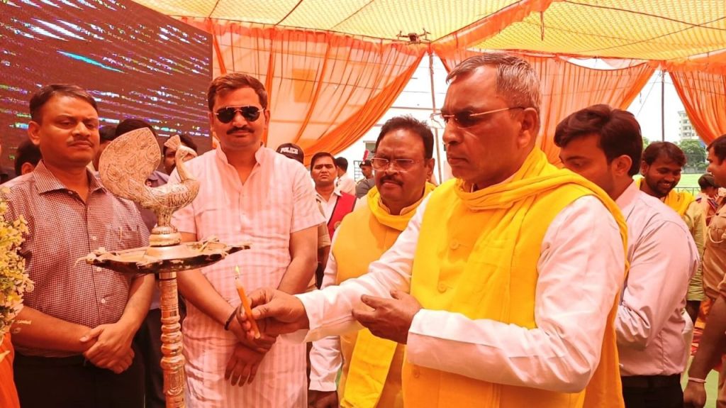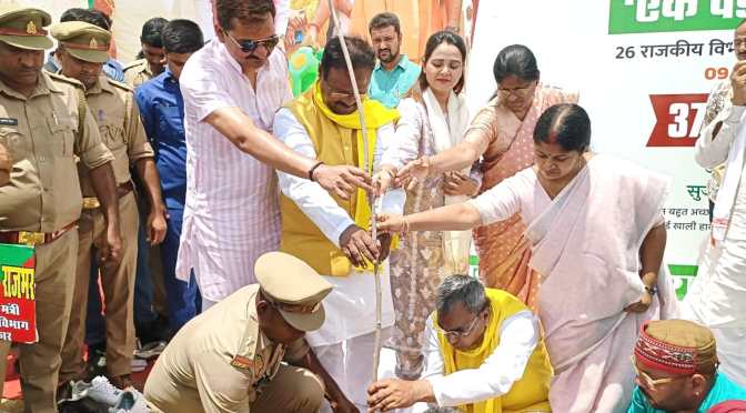 गाजीपुर।जनपद में ‘एक पेड़ मॉ के नाम‘ 2.0 वृक्षारोपण महाअभियान कार्यक्रम -2025 के अंतर्गत बृहद वृक्षारोपण कार्यक्रम का आयोजन नवीन स्टेडियम पुलिस लाईन में धूमधाम से आयोजित हुआ। कार्यक्रम का शुभारंभ मुख्य अतिथि कैबिनेट मंत्री, पंचायती राज तथा अल्पसंख्यक कल्याण, मुस्लिम वक्फ एवं हज विभाग उत्तर प्रदेश सरकार ओम प्रकाश राजभर, एंव शासन से नामित नोडल अधिकारी/आयुक्त वाराणसी मण्डल एस. राजलिंगम ,उपस्थित विशिष्ट अतिथियों ने दीप प्रज्ज्वलित कर किया । कार्यक्रम स्थल पर लगभग 300 पौधरोपण किया गया। कार्यक्रम के दौरान राजकीय बालिका इण्टर कालेज की छात्राओ द्वारा सरस्वती वन्दना एवं स्वागतगीत, गंधर्व म्युजिक की टीम, गायक राकेश कुमार द्वारा सांस्कृतिक कार्यक्रम व सल्टूराम एण्ड टीम द्वारा धोबियां नृत्य की प्रस्तुति दी गई जो सराहनीय रहा।