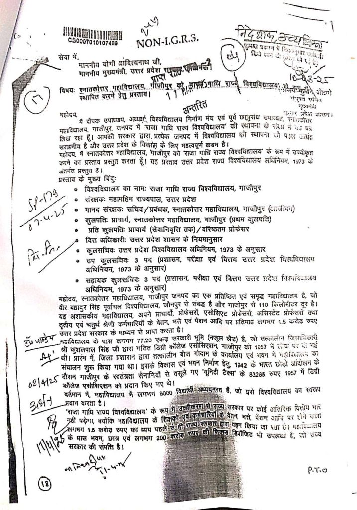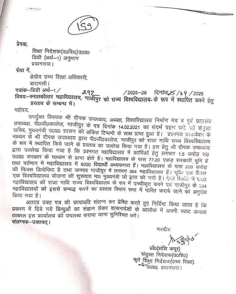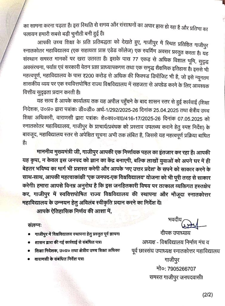 पत्रक के माध्यम से बताया गया कि गाजीपुर में 360 से अधिक महाविद्यालय होने के बावजूद एक भी विश्वविद्यालय नहीं है। सभी महाविद्यालय लगभग 150 किलोमीटर दूर स्थित जौनपुर विश्वविद्यालय से संबद्ध हैं, जिससे लाखों छात्र छात्राओं को पंजीकरण से लेकर परीक्षा तक अनेक समस्याओं का सामना करना पड़ता है। श्री उपाध्याय ने बताया कि उनकी पिछली गुहार पर मुख्यमंत्री के निर्देश पर शासन स्तर से स्नातकोत्तर महाविद्यालय, गाजीपुर को स्ववित्तपोषित राज्य विश्वविद्यालय हेतु प्रस्ताव प्रस्तुत करने के निर्देश दिए गए थे, परंतु महाविद्यालय से अपेक्षित सूचना अभी भी लंबित है।