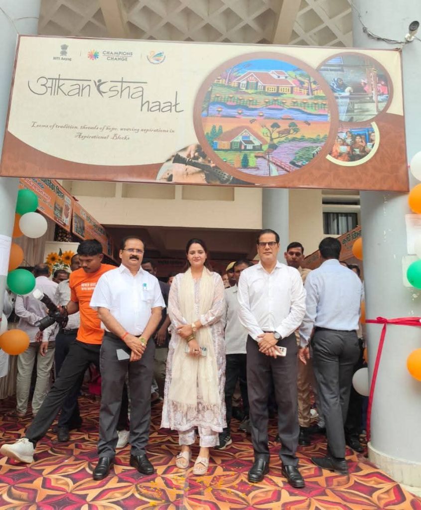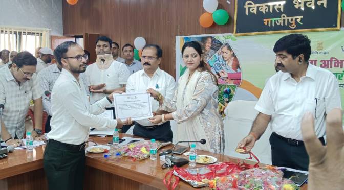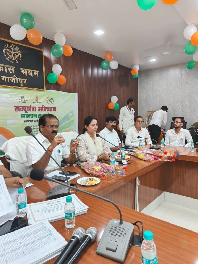 गाजीपुर।नीति आयोग द्वारा चयनित आकान्क्षात्मक विकास खण्ड कार्यक्रम के अंतर्गत जनपद स्तर पर शुक्रवार को विकास भवन सभागार में “सम्पूर्णता अभियान सम्मान समारोह” एवं विकास भवन परिसर में “आकांक्षा हाट” का आयोजन किया गया। कार्यक्रम की मुख्य अतिथि जिला पंचायत अध्यक्ष सपना सिंह रही। कार्यक्रम का आयोजन भारत सरकार व राज्य सरकार के निर्देश के क्रम में किया गया। कार्यक्रम का शुभारम्भ मुख्य अतिथि द्वारा दीप प्रज्जवलित कर किया गया। तदोपरांत मुख्य अतिथि व मुख्य विकास अधिकारी द्वारा आकांक्षा हाट में विभिन्न विभागों द्वारा लगाए गए स्टाल का निरीक्षण करते हुए स्वयं सहायता समूह की महिलाओं द्वारा तैयार किए गए उत्पादों की प्रशंसा की गई। साथ ही उनका उत्साहवर्धन किया गया।