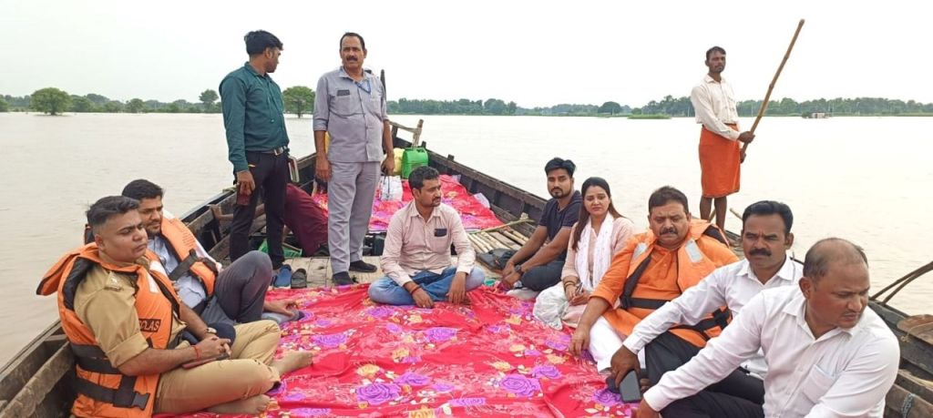 गाजीपुर। जनपद मे बाढ़ की स्थिति को देखते हुए जनपद के प्रभारी मंत्री / राज्यमंत्री (स्वतंत्र प्रभार) स्टाम्प तथा न्यायालय शुल्क एवं पंजीयन विभाग, उ0प्र0 सरकार रवींद्र जायसवाल ने आज विकास खंड करंडा अंतर्गत प्राथमिक विद्यालय दीनापुर मे बाढ़ से प्रभावित लोगो मे राहत किट का वितरण किया। नाव के माध्यम से प्रभावित ग्रामो का निरीक्षण किया। उन्होंने लोगो को सरकार की तरफ से हर सम्भव मदद का आश्वासन भी दिया। इस दौरान जिला पंचायत अध्यक्ष सपना सिंह भी मौजूद रही।