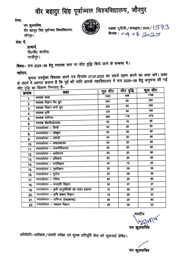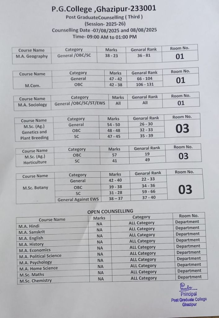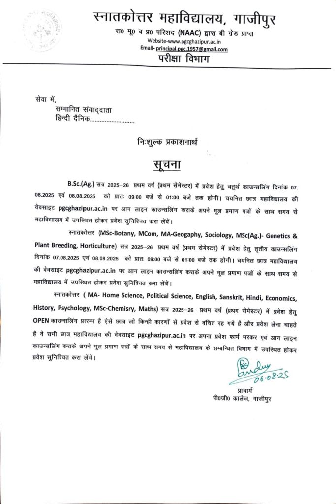 प्रोफेसर पाण्डेय ने बताया कि स्नातकोत्तर (एमए-गृह विज्ञान, राजनीतिशास्त्र, अंग्रजी, संस्कृत, हिंदी, अर्थशास्त्र, इतिहास, मनोविज्ञान, एमएससी रसायनशास्त्र, गणित सत्र: 2025-26 प्रथम वर्ष (प्रथम सेमेस्टर) में प्रवेश हेतु ओपन काउन्सलिंग प्रारम्भ है। उन्होंने यह भी बताया कि बीए, बीकॉम, बीपीईएस में प्रवेश के लिए इच्छुक