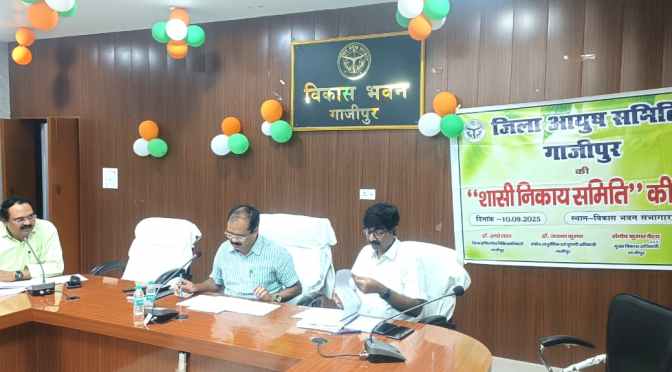 गाजीपुर।जिलाधिकारी अविनाश कुमार के आदेशानुसार मुख्य विकास अधिकारी संतोष कुमार वैश्य की अध्यक्षता में जिला आयुष समिति की बैठक सम्पन्न हुई। जिसमें जिला आयुष समिति के खाते में उपलब्ध धनराशि एवं बजट मांग पत्र, जनपद में चल रहे पब्लिक हेल्थ प्रोग्राम (कारुण्य प्रशामक सेवा), जनपद में संचालित समस्त आयुष्मान आरोग्य मंन्दिर व योग वेलनेस सेन्टर पर कार्यरत योग प्रशिक्षकों के कार्यों की समीक्षा हुई।जिला आयुष समिति के द्वारा उचित दिशा-निर्देश दिया गया। बैठक में जिला आयुष समिति के मुख्य कार्यकारी अधिकारी डा. जयन्त कुमार, सह-कार्यकारी अधिकारी डा. अच्छेलाल, प्राचार्य प्रो० डा. राजेन्द्र राजपूत, जिला कार्यकम प्रबंधक (आयुष), समस्त आयुष समिति के सदस्यगण एवं आयुष्मान आरोग्य मंन्दिर एवं योग वेलनेस सेन्टर के प्रभारी चिकित्साधिकारी एवं योग प्रशिक्षक, तथा नीमा संगठन के पदाधिकारी उपस्थित रहें।