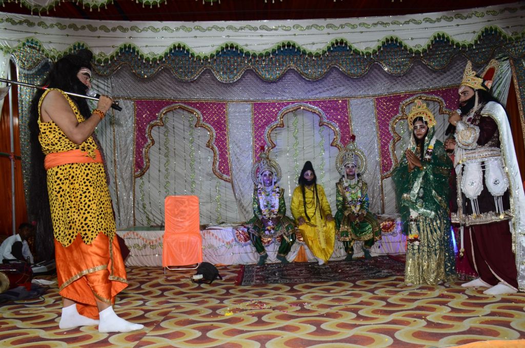 लीला के दौरान दर्शाया गया कि एक समय महाराज जनक के दरबार में शिव जी का पुराना धनुष रखा था जो किसी से उठाया नहीं जा सकता था। उस धनुष को सीता जी एक स्थान से दूसरे स्थान पर उठाकर के रख दीं। महाराज जनक को जब पता चला तो उन्होंने कुछ दिन बाद स्वयंवर रचाया जिसमें सभी राज्य के राजाओं को निमंत्रण भेजा गया था इसके साथ ही दूतों द्वारा महामुनि विश्वामित्र को भी निमंत्रण भेजा गया था। निमंत्रण पा करके सभी राजा एकत्रित हो गए साथ ही लंका नरेश रावण तथापाताल लोक के बाणासुर भी स्वयंवर में उपस्थित थे कुछ देर तक रावण और बाणासुर का संवाद चला। निमंत्रण पाकर महामुनि विश्वामित्र अपने दोनों शिष्य श्री राम लक्ष्मण के साथ स्वयंवर में पहुंचते हैं। जब महाराज जनक को दूतों पता चलता कि महर्षि विश्वामित्र स्वयंवर के बाहर खड़े हैं। तो वे अपने गुरु शतानंद जी के साथ अपने आसन से उठकर गेट पर आते है और महामुनि विश्वामित्र जी को आदर के साथ स्वयंवर में ले जाकर उच्चासन पर विराजमान होने का निवेदन करते हैं। महामुनि विश्वामित्र दोनों शिष्यों के साथ आसन पर विराजमान होते हैं।