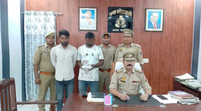 गाजीपुर। सोमवार को थाना कोतवाली पुलिस ने 21 सितंबर को महाराजगंज कस्बा में 75000/ रुपये की लूट करने वाले 02 अभियुक्तों को गिरफ्तार किया। उ0नि0 अशोक कुमार सिंह ने 21.09.2025 को महाराजगंज कस्बा में 75000/ रुपये की लूट करने वाले 02 अभियुक्तों वकील कुमार बिन्द तथा राजेश कुमार बिन्द को महाराजगंज कस्बा से गिरफ्तार कर लिया। गिरफ्तार अभियुक्त के ऊपर नियमानुसार अग्रिम विधिक कार्यवाही की जा रही है। लूट की घटना में इस्तेमाल की गई मोटरसाइकिल भी बरामद हुई। घटना मे प्रयोग मोटर साइकिल स्प्लेण्डर नं0 UP61BP7337 है।