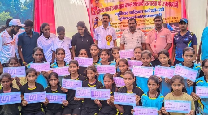 गाजीपुर।पं0 दीनदयाल उपाध्याय जन्मशताब्दी के अवसर पर जूनियर बालिकाओ की खो-खो प्रतियोगिता का आयोजन मिशन शक्ति के अन्तर्गत नेहरु स्टेडियम गोराबाजार गाजीपुर के प्रांगण में किया गया। इस प्रतियोगिता का समापन एवं पुरस्कार वितरण के मुख्य अतिथि दिलीप कुमार, जिला युवा कल्याण अधिकारी के कर कमलो द्वारा किया गया । इस प्रतियोगिता में कुल 08 टीमों ने प्रतिभाग किया । जिसका पहला सेमीफाइनल मैच नेहरु स्टेडियम ए गाजीपुर बनाम रामपुर माझा के मध्य खेला गया।जिसमें नेहरु स्टेडियम ए गाजीपुर 13 अंक एवं रामपुर माझा 03 अंक प्राप्त किया। जिसमें नेहरु स्टेडियम ए गाजीपुर 10 अंको से विजयी रही, दुसरा सेमीफाइनल मैच बी0एस0डी0 पब्लिक स्कूल रेवतीपुर बनाम नेहरु स्टेडियम बी के मघ्य खेला गया । जिसमें बी0एस0डी0 पब्लिक स्कूल रेवतीपुर 12 अंक एवं नेहरु स्टेडियम बी 08 अंक प्राप्त किया जिसमें बी0एस0डी0 पब्लिक स्कूल रेवतीपुर 04 अंकों से विजयी रही । इस प्रतियोगिता का फाइनल मैंच नेहरु स्टेडियम गाजीपुर ए बनाम बी0एस0डी0 पब्लिक स्कूल रेवतीपुर के मध्य खेला गया।जिसमें नेहरु स्टेडियम ए गाजीपुर 08 अंक एवं बी0एस0डी0 पब्लिक स्कूल रेवतीपुर 05 अंक प्राप्त किया, जिसमें नेहरु स्टेडियम ए गाजीपुर 03 अंकों से विजयी रही । प्रतियोगिता संचालन के रुप में राधेश्याम सिंह यादव खो-खो प्रशिक्षक के द्वारा किया गया । आफिशियल के रुप में शिवानी राय, अंशु राय. पिन्टु यादव, अभिषेक पाल, विनोद यादव, सुनील यादव, बन्दना, अजित यादव, रागिनी, सौरभ राय रहें । इस अवसर पर सावित्री कुशवाहा, पुनम, विनोद कुमार जायसवाल, विजय, बृजेश कुमार, योगेन्द्र सिंह, मु0 मोईन, एवं समस्त स्टाप उपस्थित रहें। अन्त में अरविन्द यादव क्रीड़ाधिकारी द्वारा सभी आगन्तुओ एवं खिलाड़ियो के प्रति आभार व्यक्त किया ।
