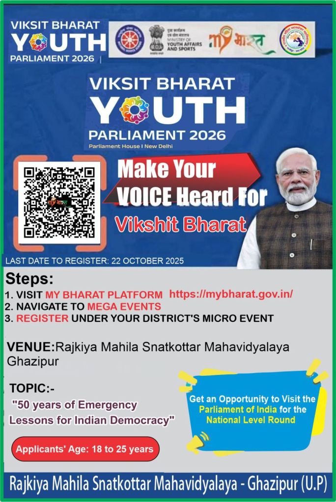 गाजीपुर। राजकीय महिला स्नातकोत्तर महाविद्यालय महुआबाग में भारत सरकार युवा कार्यक्रम एवं खेल मंत्रालय युवा कार्यक्रम विभाग एवं राष्ट्रीय सेवा योजना के संयुक्त तत्वाधान में जिला स्तरीय प्रतियोगिता “विकसित भारत युवा संसद 2026” का आयोजन आगामी नवंबर माह में होने जा रहा है । इस युवा संसद में 18 से 25 वर्ष आयु वर्ग तक के युवा प्रतिभाग कर सकते है । इसमें प्रतिभाग करने हेतु सभी प्रतिभागियों को माय भारत पोर्टल पर रजिस्ट्रेशन करना होगा जिसकी अंतिम तिथि 22 अक्टूबर है ।
