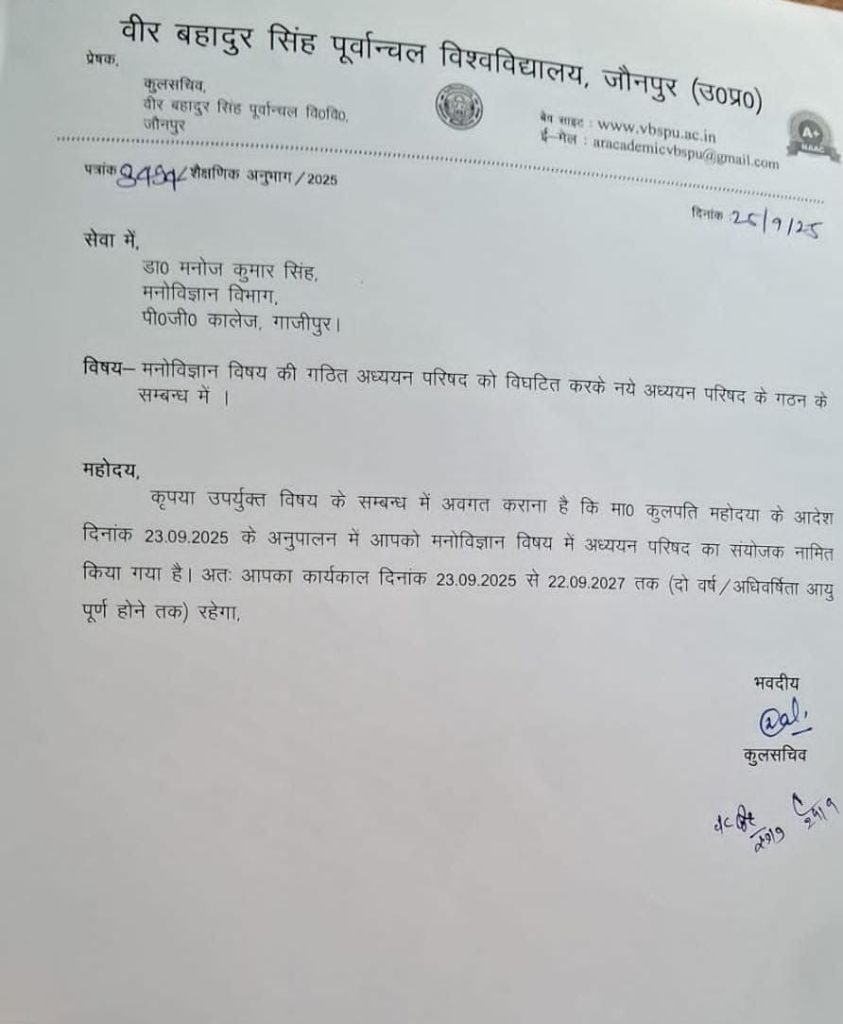 गाज़ीपुर। उत्तर प्रदेश राज्य विश्वविद्यालय अधिनियम, 1973 की धारा 68 के अधीन डॉ. मनोज कुमार सिंह द्वारा राज्यपाल के समक्ष प्रस्तुत वाद (संदर्भ संख्या 35/2024, डॉ. मनोज कुमार सिंह बनाम कुलपति) के प्रश्नगत प्रकरण पर एक महत्वपूर्ण घटनाक्रम सामने आया है। अंतिम निस्तारण से पूर्व, कुलपति प्रो. वंदना सिंह ने विश्वविद्यालय में मनोविज्ञान विषय के नियम विरुद्ध गठित अध्ययन परिषद को भंग कर दिया है और पूर्व संयोजक की नियुक्ति निरस्त करते हुए, डॉ. मनोज कुमार सिंह को वीर बहादुर सिंह पूर्वांचल विश्वविद्यालय के मनोविज्ञान विषय के अध्ययन परिषद का नया संयोजक नियुक्त किया है।