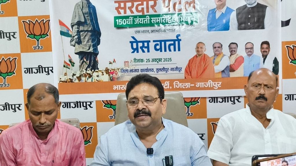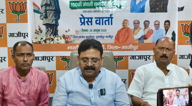 गाजीपुर।भारत के प्रथम गृह मंत्री लौह पुरष सरदार वल्लभभाई पटेल के 150 वीं जयंती समारोह अभियान को लेकर शनिवार को भाजपा जिला कार्यालय छावनी लाइन पर जिले के प्रभारी मंत्री राज्यमंत्री (स्वतंत्र प्रभार), स्टाम्प तथा न्यायालय शुल्क एवं पंजीयन विभाग उ0प्र0 सरकार रविंद्र जायसवाल द्वारा मिडिया प्रतिनिधियों के साथ प्रेस वार्ता कीं। प्रेसवार्ता के दौरान बताया कि भारत के प्रथम गृहमंत्री भारत रत्न सरदार वल्लभभाई पटेल के सरदार/150 यूनिटी मार्च वी जयंती समारोह अभियान में जिले भर मे 31 अक्टूबर से 6 दिसंबर 2025 तक रन फॉर यूनिटी तीन स्तरीय पदयात्रा व अन्य कार्यक्रम का आयोजन किया जाएगा। उन्होंने बताया की लोकसभा के अंतर्गत सभी विधानसभाओं में 1 नवंबर से 25 नवंबर के बीच 8 किलोमीटर की पद यात्रा होगी। प्रत्येक जनपदों से पांच -पांच युवा प्रतिनिधि के रूप में सरदार वल्लभभाई पटेल के जन्म भूमि करमसद पहुंचेंगे। उन्होंने बताया कि जनपद गाजीपुर में 31 अक्टूबर को प्रत्येक वर्ष के भाति इस वर्ष भी रन फॉर यूनिटी का कार्यक्रम संपन्न होगा। जिसमें स्थानीय स्तर के खिलाड़ी व युवा भारी संख्या मे शामिल होंगे। इस अभियान में अखंड भारत से आत्मनिर्भर भारत की भावना को बढ़ावा दिया जाएगा। इस अवसर पर पूरे अभियान में विद्यालय पार्क कॉलेज शैक्षिक संस्थानों में कार्यक्रम आयोजित किए जाएंगे, जिसमें निबंध प्रतियोगिता, भाषण प्रतियोगिता, रंगोली प्रतियोगिता, चित्रकला प्रतियोगिता भी आयोजित की जाएगी। प्रेस वार्ता में जिला प्रभारी डा. राकेश त्रिवेदी, जिला पंचायत अध्यक्ष सपना सिंह, नगर पालिका अध्यक्ष सरिता अग्रवाल, पूर्व जिलाध्यक्ष सुनील सिंह, भानुप्रताप सिंह, जिला मीडिया प्रभारी शशिकान्त शर्मा उपस्थित थे।