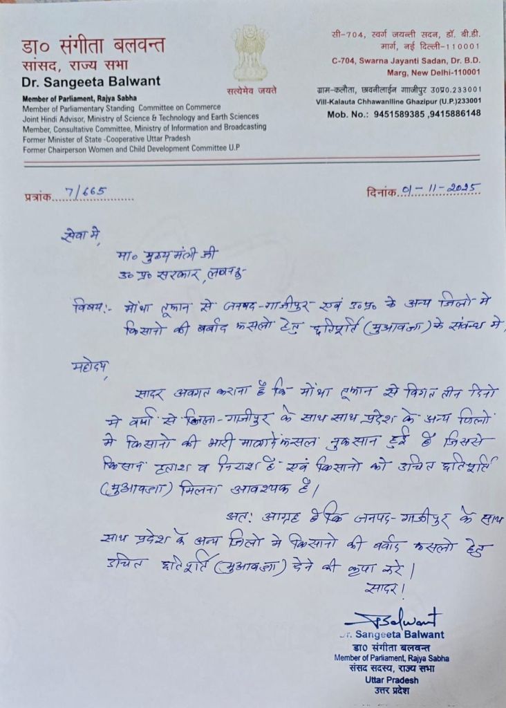 राज्यसभा सांसद डा. संगीता बलवंत ने अपने पत्र में उल्लेख किया है कि ‘मोंथा’ तूफान के कारण पिछले तीन दिनों से गाजीपुर सहित पूरे प्रदेश में भारी वर्षा हुई है। इस बारिश से धान, सरसों, चना जैसी फसलों को भारी नुकसान पहुंचा है।