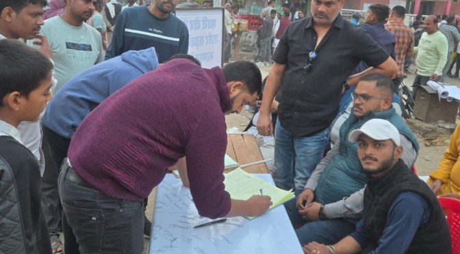 ग़ाज़ीपुर।शनिवार को नगर के जर्ज़र सड़को के खिलाफ चल रहे हस्ताक्षर अभियान के पांचवे दिन सिटी रेलवे स्टेशन क्षेत्र मे आज कुल अब तक 5800 लोगो ने हस्ताक्षर कर अभियान का समर्थन किया। हस्ताक्षर अभियान की अगुआई कर रहे विवेक कुमार सिंह ‘शम्मी’ ने कहा की समय से कार्य ना पूरा करने के लिए कार्यदायी संस्थाओ की जिम्मेदारी तय होनी चाहिए तथा कार्य न करने पर कार्यवाही होनी चाहिए।