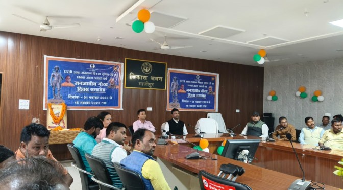 गाजीपुर।स्वतंत्रता संग्राम सेनानी और आदिवासी लोकनायक बिरसा मुंडा की जयंती शनिवार को ‘जनजातीय गौरव दिवस‘ के रूप में मनाई गयी। मुख्य अतिथि सुभाष चन्द्र सरोज, जिला विकास अधिकारी, गाजीपुर की अध्यक्षता में विकास भवन सभागर में जनजातीय गौरव दिवस-2025 हर्षाेल्लास के साथ मनाया गया। कार्यक्रम का शुभारंभ जिला विकास अधिकारी द्वारा भगवान बिरसा मुण्डा के फोटो चित्र पर माल्यार्पण कर एवं दीप प्रज्वलित कर किया गया। कार्यक्रम में भगवान बिरसा मुण्डा के साथ-साथ सभी आदिवासी स्वतंत्रता सेनानियों, स्वतंत्रता संग्राम और सांस्कृतिक विरासत में उनके योगदान को याद किया गया। देदियापाड़ा, गुजरात में आयोजित जनजातीय गौरव वर्ष समारोह-2025 में प्रधानमंत्री द्वारा संबोधित कार्यक्रम का लाइव प्रसारण कराया गया।जिसे उपस्थित जनजातीय समुदाय के लोगों द्वारा काफी उत्साहित होकर देखा गया।