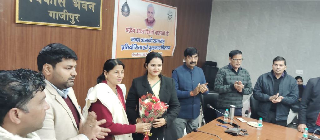 गाजीपुर। मुख्य सचिव उत्तर प्रदेश शासन के निर्देश पर जनपद मुख्यालय स्थित विकास भवन सभागार में गुरुवार को भारत रत्न अटल बिहारी वाजपेई की जन्मशताब्दी समारोह का आयोजन किया गया। कार्यक्रम का शुभारंभ मुख्य अतिथि जिला पंचायत अध्यक्ष सपना सिंह एवं मुख्य विकास अधिकारी संतोष कुमार वैश्य, प्रोफेसर अनीता कुमारी प्राचार्य राजकीय महिला कॉलेज एवं श्री प्रकाश सिंह जिला विद्यालय निरीक्षक द्वारा श्री वाजपेई की प्रतिमा पर माल्यार्पण एवं दीप प्रज्वलन कर किया गया।