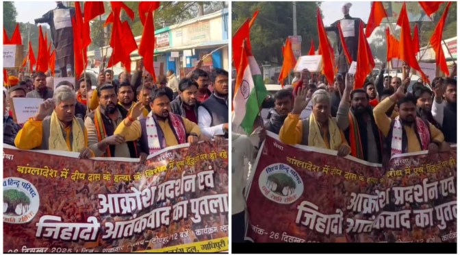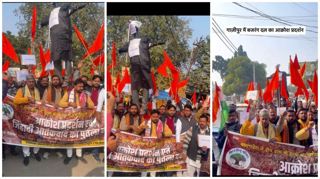 गाजीपुर। बांग्ला देश में दलित हिंदू दीपू दास की निर्मम हत्या को लेकर जिला मुख्यालय स्थित सरजू पाण्डे पार्क में बजरंग दल के कार्यकर्ताओं ने पुतला फूंक विरोध जताया। बजरंग दल के पदाधिकारियों और कार्यकर्ताओं का कहना है कि बांग्ला देश के कट्टरपंथी जेहादी आतंकी संगठनों के द्वारा खुलेआम हत्या की गई और यह कृत्य मुहम्मद यूनिस बांग्ला देश का कार्यवाहक सरकार का मुखिया के सहयोग और सहमति से हो रहा है जिससे वहां रह रहे हिंदुओं में भयभीत का माहौल व्याप्त है। कहा कि इस भय को दूर करने तथा हम सनातनी हिंदू विरोध प्रदर्शन करके अपनी भावना व्यक्त कर रहे हैं। इसलिए हम लोगों द्वारा शुक्रवार को सरजू पांडे पार्क में एकत्रित होकर यूनिस तथा जेहादियों का शांति पूर्वक पुतला दहन किया गया।