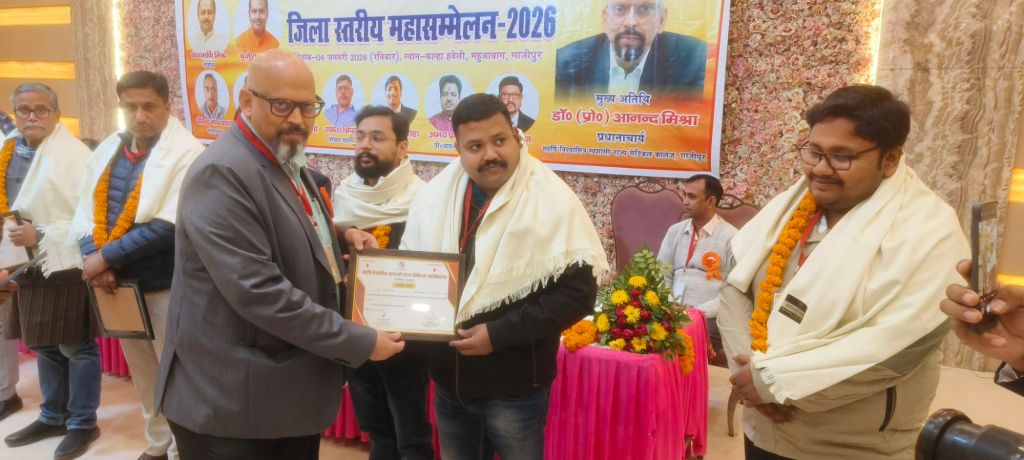 गाजीपुर। रविवार को केमिस्ट एंड ड्रगिस्ट एसोसिएशन (GCDA) द्वारा जनपद स्तरीय “सभा महासम्मेलन 2026” का भव्य आयोजन कान्हा हवेली, महुआबाग में किया गया। कार्यक्रम के मुख्य अतिथि महर्षि विश्वामित्र स्वशासी राज्य चिकित्सा महाविद्यालय के प्रधानाचार्य प्रोफेसर (डॉ.) आनंद मिश्रा रहे। जिसमें मुख्य अतिथि का मालयार्पण , स्मीर्तिचिन्ह और अंगवस्त्र से सम्मान किया गया। कार्यक्रम का कुशल संचालन संस्था के संगठन मंत्री राकेश त्रिपाठी द्वारा किया गया।