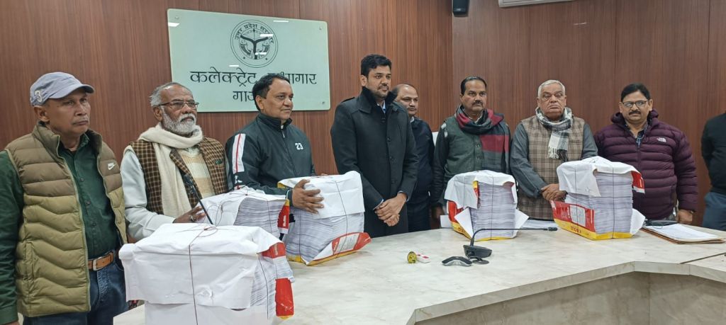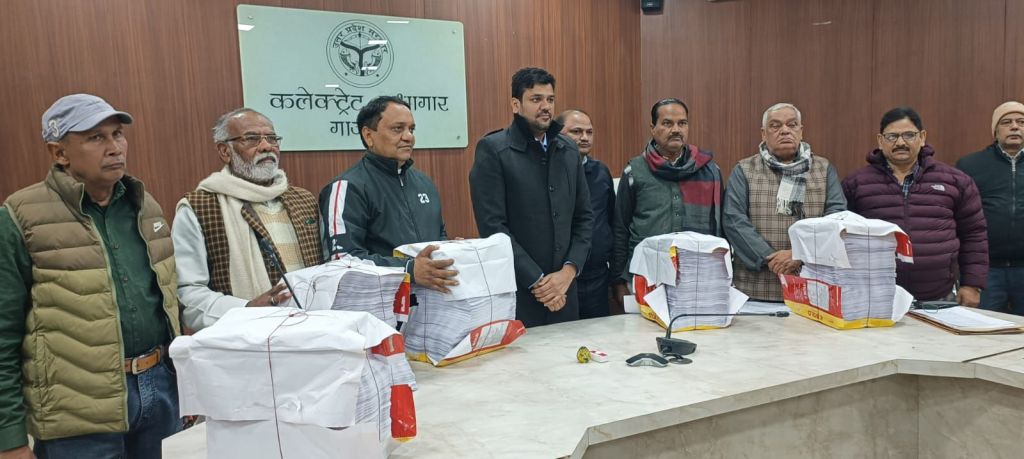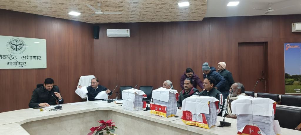 गाजीपुर। मंगलवार को कलेक्ट्रेट सभागार मे जिला निर्वाचन अधिकारी/जिलाधिकारी अविनाश कुमार की अध्यक्षता मे निर्वाचक नामावलियो के विशेष प्रगाढ पुनरीक्षण कार्य अन्तर्गत आलेख्य प्रकाशन के अवसर पर समस्त मान्यता प्राप्त दलो के साथ बैठक आहूत की गयी। जिसमे विभिन्न राजनैतिक दलो के पदाधिकारियों ने प्रतिभाग किया जिसमे सहायक जिला निर्वाचन अधिकारी देवी प्रसाद सिंह, रविकान्त राय काग्रेस, राजन प्रजापति भाजपा, सुभाष राम सिपाही बसपा, राजेश यादव सपा, जावेद अहमद आप पार्टी माजूद रहे। इस दौरान विधान सभा निर्वाचन क्षेत्रों की निर्वाचक नामावलियों का आलेख्य प्रकाशन कर मतदाता सूची उपस्थित राजनैतिक दलो के पदाधिकारियों को हस्तगत कराया गया।