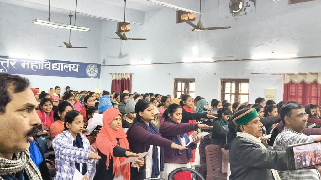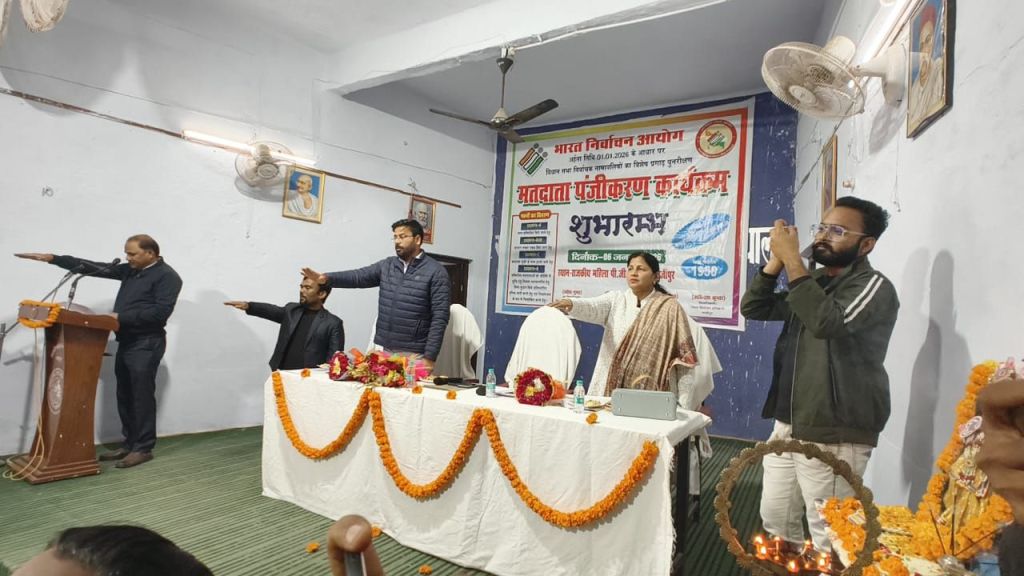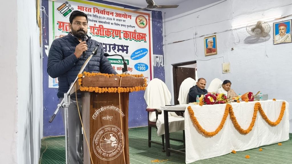 गाजीपुर। भारत निर्वाचन आयोग द्वारा विशेष पुनरीक्षण अभियान के तहत 1 जनवरी 2026 को अहर्ता प्राप्त कर रहे नवीन मतदाताओं के पंजीकरण एवं मतदान जागरूकता संबंधी जनपद स्तरीय कार्यक्रम का आयोजन राजकीय महिला पीजी कॉलेज महुआबाग में मंगलवार को हुआ। कार्यक्रम का शुभारंभ मुख्य अतिथि दिनेश कुमार उप जिला निर्वाचन अधिकारी/अपर जिला अधिकारी गाज़ीपुर एवं प्राचार्य प्रोफेसर अनिता कुमारी द्वारा दीप प्रज्वलन एवं सरस्वती प्रतिमा पर माल्यार्पण कर कार्यक्रम का फीता काट कर मतदाता पंजीयन कार्यक्रम का शुभारंभ किया गया । मतदाता पंजीयन कार्यक्रम में उपस्थित सभी जनपद स्तरीय अधिकारियों एवं निर्वाचन विभाग के कर्मचारी एवं छात्राओं का स्वागत कार्यक्रम संयोजक डॉ शिव कुमार द्वारा किया गया। कार्यक्रम का विषय प्रवर्तन करते हुए राजनीति विभाग के असिस्टेंट प्रोफेसर डॉ राजेश कुमार यादव ने छात्राओं को भारतीय लोकतंत्र में मतदान एवं मतदाताओं की महत्ता से परिचय कराते हुए मतदाता सूची में मतदाताओं का पंजीकरण को अनिवार्य एवं अपरिहार्य बताया। इससे पूर्व अपर जिलाधिकारी वि/रा दिनेश कुमार ने महाविद्यालय के राष्ट्रीय सेवा योजना के निर्वाचन साक्षरता क्लब की ओर से मतदाता पंजीकरण स्टॉल का फीता काटकर उद्घाटन किया तथा छात्रों को अधिक से अधिक लोगों को मतदाता बनने के लिए अपील किया।