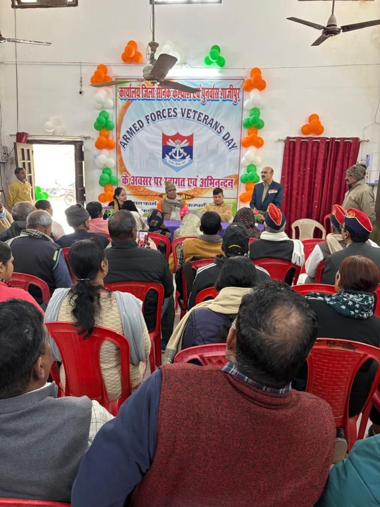 गाजीपुर। जिला सैनिक कल्याण एवं पुनर्वास कार्यालय के प्रांगण में 10 वां आर्मड फोर्सेज वेटरंस डे कार्यक्रम का आयोजन किया गया। जिसमें कारगिल शहीद की पत्नियों 04 व वीरता पुरस्कार से जनपद के सम्मानित 05 पूर्व सैनिकों एवं जनपद के शहीद सैनिकों की पत्नियों 15 तथा पूर्व सैनिकों को अंगवस्त्र एवं मोमेन्टो देकर सम्मानित किया गया। कार्यक्रम में 100 से अधिक जनपद के पूर्व सैनिक एवं आश्रित उपस्थित थे। कार्यक्रम का संचालन जिला सैनिक कल्याण एवं पुनर्वास अधिकारी गाजीपुर के द्वारा किया गया। आर्मड फोर्सेज वेटरंस डे के कार्यक्रम में मुख्य रूपसे दो संस्थाओं इरिसन फार्मर प्रोड्यूसर कम्पनी लिमिटेड एवं भदौरा फार्मर प्रोड्यूसर कम्पनी लिमिटेड ने विशेष रूप से अपना सहयोग प्रदान किया। इरिसन फार्मर कम्पनी के प्रबंधक मुरलीधर सिंह ने कार्यक्रम में सफल आयोजन होने पर प्रसन्नता व्यक्त की गई। जिला सैनिक कल्याण एवं पुनर्वास कार्यालय के विनोद कुमार, बालकृष्ण सिंह यादव, विनोद त्रिपाठी, हरिहर यादव, हीरालाल एवं मुन्नी उपस्थित रहे। समारोह का समापन जिला सैनिक कल्याण एवं पुनर्वास अधिकारी विंग कमांडर मो० निशात अफजल (अ०प्रा०) ने सभी का आभार व्यक्त कर किया।
