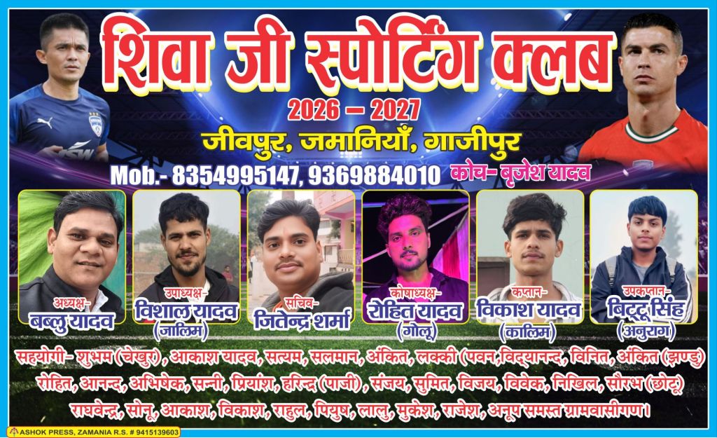 गाजीपुर।शिवाजी स्पोर्टिंग क्लब जीवपुर के तत्वावधान में होने वाले आगामी 18 जनवरी 2026 का फुटबाल टूर्नामेंट मैच के लिए कमेटी का गठन बबलू यादव जीवपुर के आवास पर सर्व सम्मति से किया गया। जिसमें अध्यक्ष बबलू यादव, उपाध्यक्ष विशाल यादव, सचिव जितेंद्र शर्मा, कोषाध्यक्ष गोलू यादव, कप्तान विकास यादव एवं उपकप्तान बिट्टू सिंह मनोनीत किए गए।बताया गया कि होने वाले फुटबाल टूर्नामेंट का पहला मैच आगामी 18 जनवरी को बारा बनाम रेवतीपुर के बीच खेला जाएगा। जिसमें मुख्य अतिथि युवा समाज सेवी एवं भारतीय किसान यूनियन टिकैत जमानियां तहसील अध्यक्ष गणपति सिंह यादव (बबलू) होंगें।