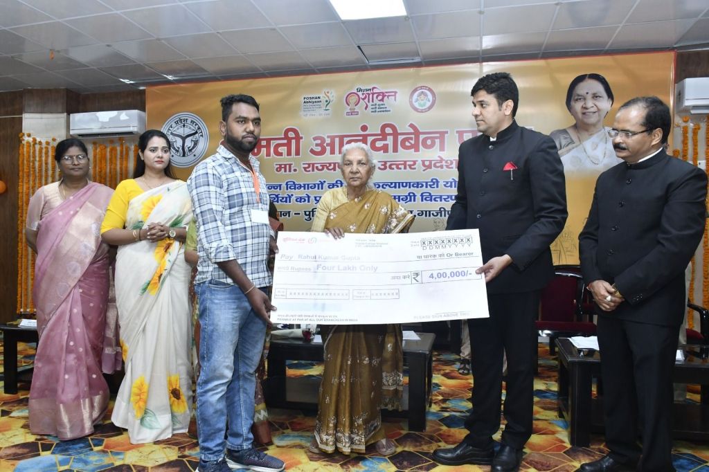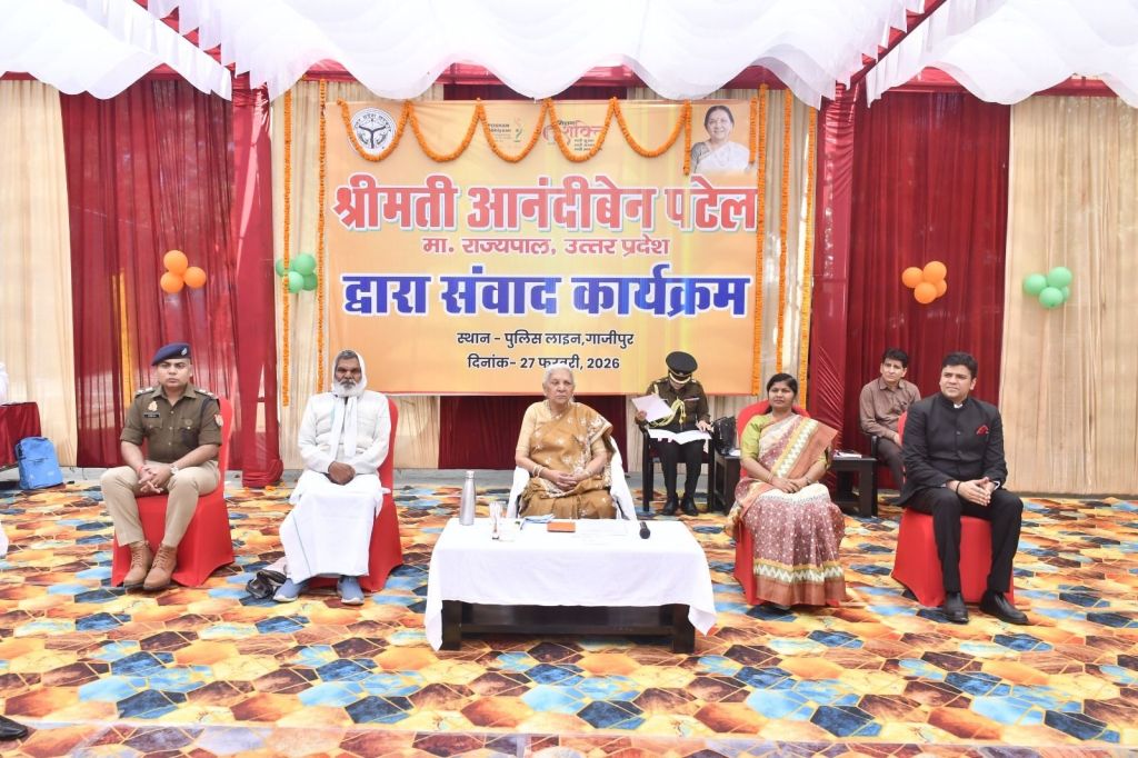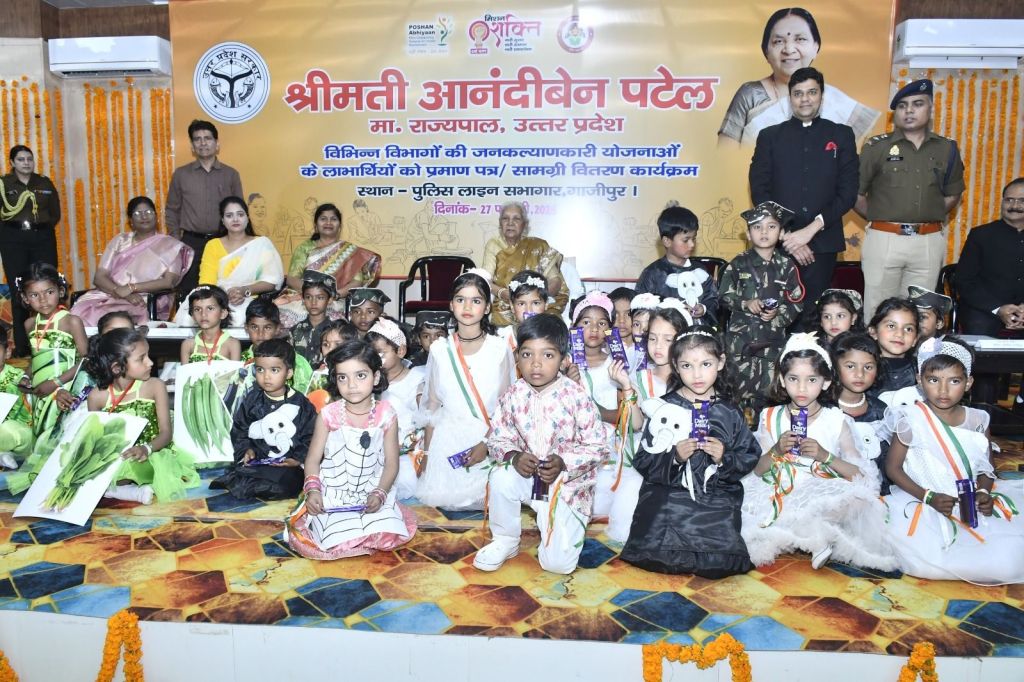 गाजीपुर। आनंदीबेन पटेल राज्यपाल उत्तर प्रदेश का शुक्रवार को एक दिवसीय जनपद भ्रमण कार्यक्रम सम्पन्न हुआ। राज्यपाल के जनपद भ्रमण कार्यकम स्थल पुलिस लाईन सभागार एवं परिसर मे विभिन्न कार्यक्रम आयोजित हुए जिसमे दिव्यांग बच्चो से संवाद कार्यक्रम के साथ दिव्यांग बच्चो मे व्हीलचेयर एवं अन्य उपकरण के साथ रिफ्रेसमेंट आदि का वितरित किया गया। तत्पश्चात राज्यपाल द्वारा विवेकाधीन कोश से सेवा कार्य हेतु समर्पित बस को हरी झण्डी दिखाकर रवाना किया गया।परिसर मे ही स्टाल के माध्यम से विभिन्न विभागो द्वारा लगाए गए प्रदर्शनी का अवलोकन करने के उपरान्त पुलिस लाईन सभागार मे विभिन्न विभागो की जनकल्याणकारी योजनाओ के लाभार्थियों को प्रमाण पत्र/सामग्री वितरण किया गया।