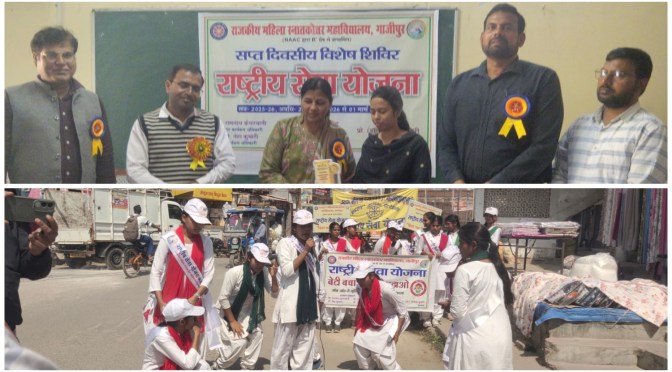 गाजीपुर। शुक्रवार को राष्ट्रीय सेवा योजना के सप्त दिवसीय शिविर के पांचवें दिन सुबह 7 बजे कार्यक्रम अधिकारीयों द्वारा छात्राओं को सुबह की प्रार्थना और योगाभ्यास कराया गया। तदुपरांत छात्रों द्वारा सूक्ष्म जलपान ग्रहण किया गया और बेटी बचाओ बेटी पढ़ाओ संबंधी एक रैली महुआ बाग से होते हुए मिश्रा बाजार तक निकाली गई।